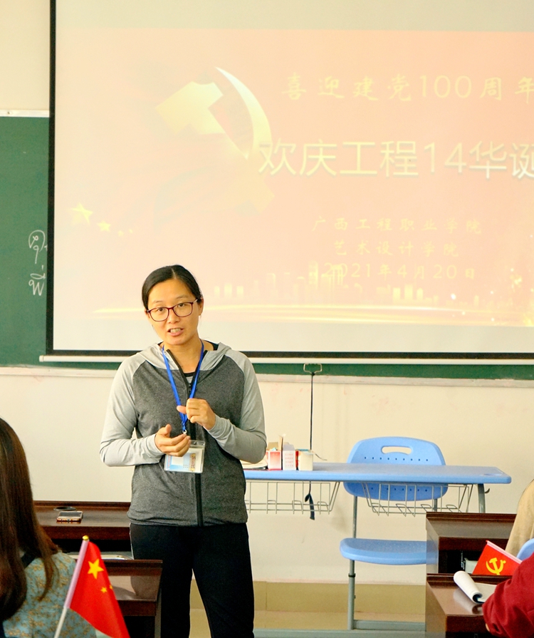 2021年4月20日下午,廣西工程職業(yè)學(xué)院藝術(shù)設(shè)計(jì)學(xué)院在設(shè)計(jì)樓402多媒體教室開(kāi)展“喜迎建黨100周年,歡慶工程14華誕”主題活動(dòng),本次活動(dòng)邀請(qǐng)了藝術(shù)設(shè)計(jì)學(xué)院黨支部書(shū)記兼副院長(zhǎng)覃鳳姣、分團(tuán)委書(shū)記兼學(xué)生科科長(zhǎng)潘翠萍、全體輔導(dǎo)員、專(zhuān)任教師以及學(xué)生代表參加了活動(dòng),活動(dòng)由藝術(shù)設(shè)計(jì)學(xué)院學(xué)生會(huì)鄭智元同學(xué)主持。