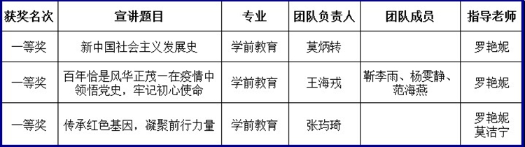 經(jīng)認真評選,最終評選出一等獎3名、二等獎8名、三等獎20名?!缎轮袊鐣髁x發(fā)展史》、《百年恰是風華正茂—在疫情中領悟黨史,牢記初心使命》、《傳承紅色基因,凝聚前行力量》等3個團隊榮獲一等獎;《新中國史之中華人民共和國的成立》、《學黨史、感黨恩、跟黨走》等5個參賽團隊榮獲二等獎;《弘揚長征精神,走好新長征路》、《一葉紅船,百年崢嶸》等20個團隊榮獲三等獎。祝賀同學們?nèi)〉脙?yōu)異成績。