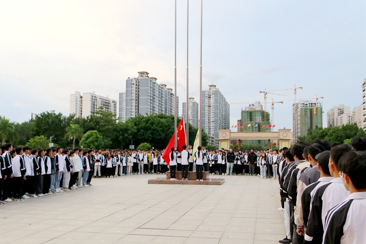 升旗儀式在國歌中正式開始,當(dāng)國旗冉冉升起,全體同學(xué)行注目禮,嚴(yán)肅而莊重。