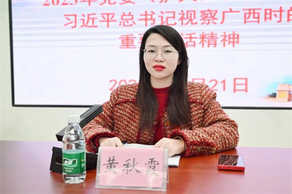 黨委委員、學(xué)生工作處副處長李麗詩作題為《奮力譜寫中國式現(xiàn)代化廣西篇章——學(xué)習(xí)習(xí)近平總書記視察廣西時的重要講話精神》的主題發(fā)言。