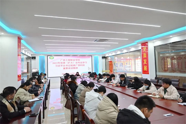 12月21日下午,廣西工程職業(yè)學(xué)院黨委(擴大)會議在圖書館一樓大數(shù)據(jù)中心召開,會議傳達(dá)學(xué)習(xí)習(xí)近平總書記視察廣西時的重要講話精神。學(xué)校黨委副書記黃秋霞,黨委委員,各黨(總)支部書記、副書記、支委,各部門負(fù)責(zé)人參加會議。會議由黃秋霞副書記主持。