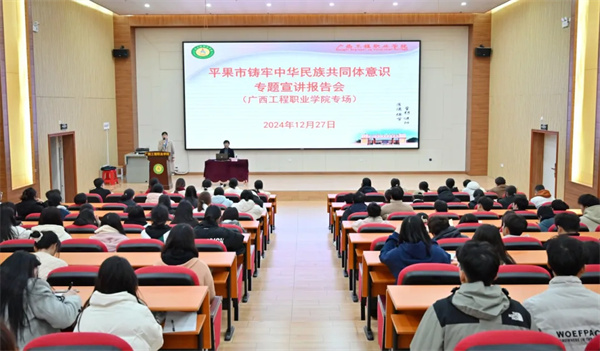 為全面貫徹落實黨的二十屆三中全會精神,深入學(xué)習(xí)貫徹習(xí)近平總書記關(guān)于加強和改進民族工作的重要思想,貫徹落實習(xí)近平總書記關(guān)于廣西工作論述的重要要求,增強鑄牢中華民族共同體意識的責(zé)任感和使命感,2024年12月27日上午,在圖文信息大樓三樓學(xué)術(shù)報告廳,我校舉辦鑄牢中華民族共同體意識專題宣講報告會。學(xué)校黨員干部、專任教師、輔導(dǎo)員和學(xué)生代表等200多人參加宣講報告會,報告會由黨委辦公室副主任黃香琴主持。