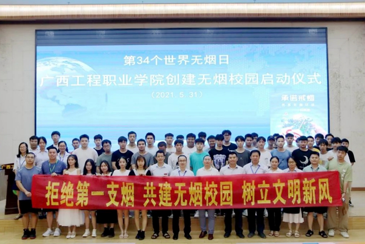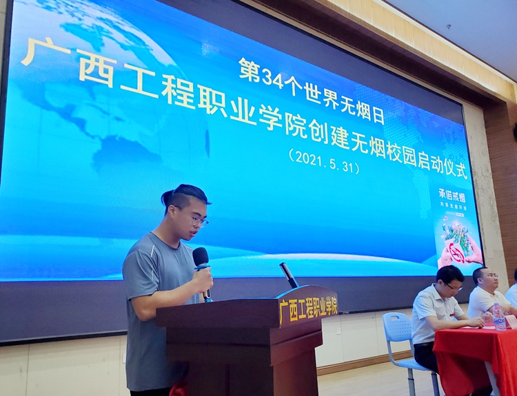 2021年5月31日是第34個世界無煙日,我校在圖文信息大樓報告廳舉行廣西工程職業(yè)學(xué)院創(chuàng)建無煙校園啟動儀式。學(xué)校黨委委員、副校長、宣傳部部長彭高彬,副校長吳先夏,學(xué)生工作處副處長吳發(fā)德,保衛(wèi)處副處長盧保日,后勤管理中心副處長劉兆兵,以及團委、各二級學(xué)院負責(zé)人出席儀式。各二級學(xué)院學(xué)生代表約300人參加啟動儀式。啟動儀式由汽車與機電學(xué)院學(xué)生白一凡主持。
