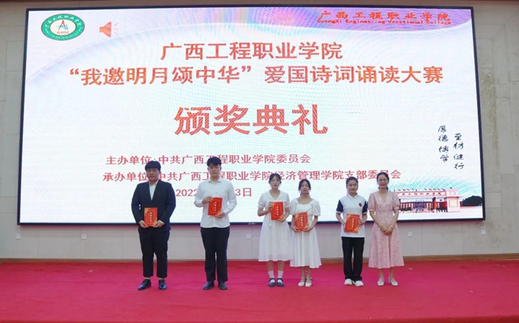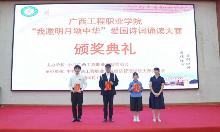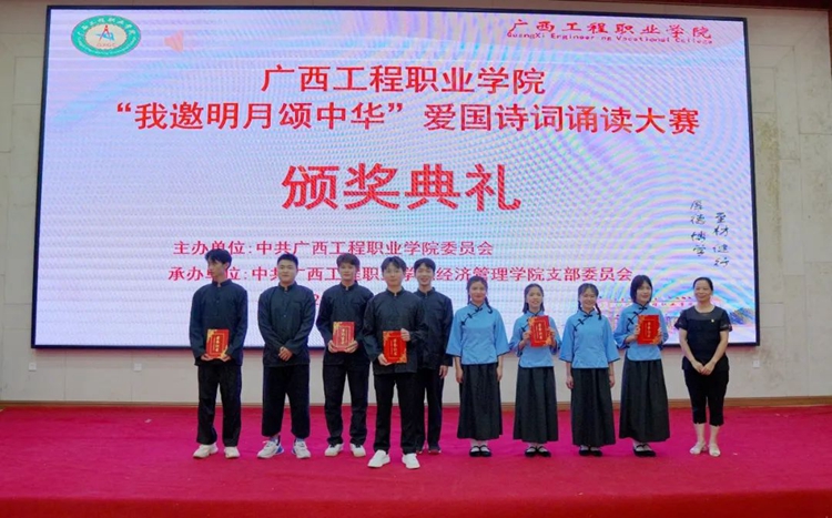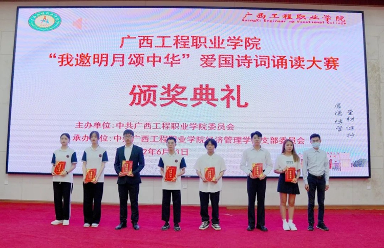 為弘揚中華優(yōu)秀傳統(tǒng)文化,以中華經(jīng)典、紅色文化鑄魂育人奏響愛黨、愛國、愛社會主義的主旋律,鑄牢中華民族共同體意識,凝聚奮進新征程、建功新時代的磅礴力量,以優(yōu)異成績迎接黨的二十大勝利召開。2022年6月13日晚,廣西工程職業(yè)學(xué)院在圖文信息一樓學(xué)術(shù)報告廳舉行“我邀明月頌中華”愛國詩詞朗誦大賽決賽。比賽由中共廣西工程職業(yè)學(xué)院委員會主辦,中共廣西工程職業(yè)學(xué)院經(jīng)濟管理學(xué)院支部委員會承辦。