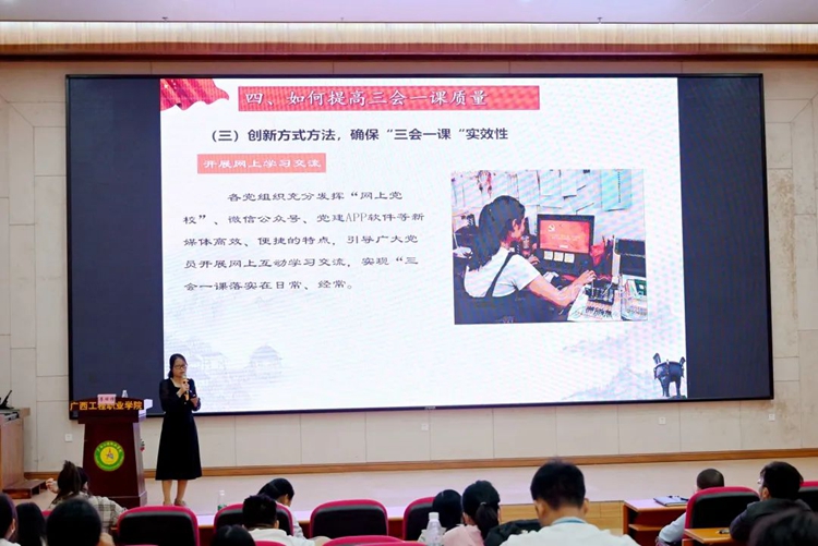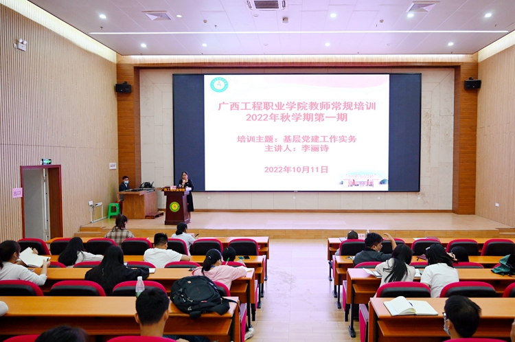 2022年10月11日,廣西工程職業(yè)學院2022年秋季學期第一期教師常規(guī)培訓在圖文信息大樓一樓報告廳舉行,學校黨委委員、學生工作處副處長李麗詩作基層黨建工作實務專題培訓。