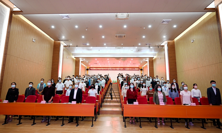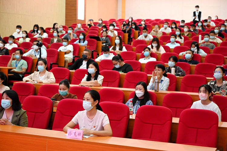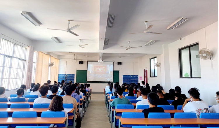 學(xué)校領(lǐng)導(dǎo)及教師代表在圖文信息大樓報(bào)告廳收聽收看黨的二十大開幕會盛況