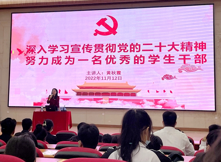 培訓(xùn)會(huì)中,黃秋霞副書(shū)記主要圍繞“中共二十大會(huì)議主題”、“黨的二十大重要內(nèi)容解讀”、“貫徹落實(shí)習(xí)總書(shū)記的講話”、“如何成為一名優(yōu)秀的學(xué)生干部”等方面,與同學(xué)們一起學(xué)習(xí)了黨的二十大報(bào)告的深刻內(nèi)涵,重溫黨的二十大報(bào)告中對(duì)青年的寄語(yǔ)。并以生動(dòng)鮮活的例子幫助同學(xué)們深化思想認(rèn)識(shí),在學(xué)習(xí)中砥礪初心使命,汲取奮進(jìn)力量。