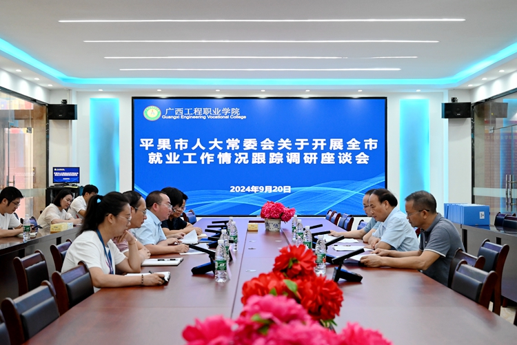 2024年9月20日上午,平果市人大常委會(huì)副主任李俊整一行到廣西工程職業(yè)學(xué)院調(diào)研就業(yè)工作。學(xué)校紀(jì)委書(shū)記、副校長(zhǎng)彭高彬,副校長(zhǎng)黃德偉,教務(wù)處、招生就業(yè)處負(fù)責(zé)人及相關(guān)工作人員參加調(diào)研會(huì)。
