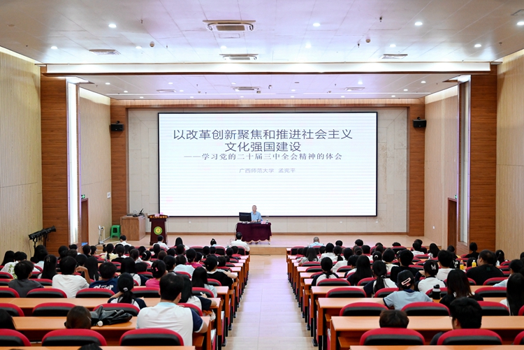 報(bào)告會(huì)上,孟憲平教授聚焦黨的二十屆三中全會(huì)精神,結(jié)合廣西高校實(shí)際,圍繞“以改革創(chuàng)新聚焦和推進(jìn)社會(huì)主義文化強(qiáng)國建設(shè)”這一主題,從深刻領(lǐng)會(huì)和把握黨的二十屆三中全會(huì)精神、深刻認(rèn)識(shí)深化文化體制機(jī)制改革的重大意義、牢牢把握深化文化體制機(jī)制改革的基本要求、文化體制機(jī)制改革的重點(diǎn)內(nèi)容和現(xiàn)實(shí)路徑等四個(gè)方面內(nèi)容,對(duì)黨的二十屆三中全會(huì)提出的深化文化體制機(jī)制改革的豐富內(nèi)涵、核心要義和實(shí)踐要求進(jìn)行了系統(tǒng)宣講和深入闡述。
