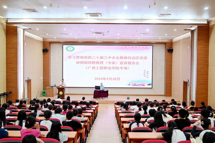 9月30日上午,學(xué)習(xí)貫徹黨的二十屆三中全會(huì)精神自治區(qū)黨委講師團(tuán)特聘教授(專家)宣講報(bào)告會(huì)在我校圖文信息大樓一樓學(xué)術(shù)報(bào)告廳舉行,自治區(qū)黨委講師團(tuán)特聘教授(專家)、廣西師范大學(xué)馬克思主義學(xué)院孟憲平教授作宣講報(bào)告。
