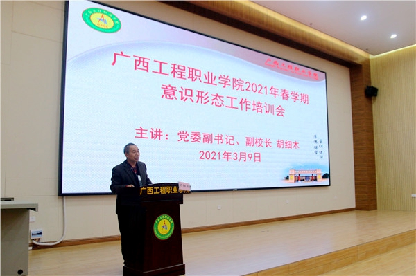 為全面部署2021年意識(shí)形態(tài)工作,落實(shí)意識(shí)形態(tài)工作責(zé)任制,3月9日下午,廣西工程職業(yè)學(xué)院在圖文信息大樓學(xué)術(shù)報(bào)告廳舉行2021年春學(xué)期意識(shí)形態(tài)工作培訓(xùn)會(huì),校黨委書記呂偉斌,校黨委副書記、副校長(zhǎng)胡細(xì)木及校長(zhǎng)助理黃德偉、黃秋霞等黨政領(lǐng)導(dǎo),各部門負(fù)責(zé)人、行政人員、無課的專任教師和輔導(dǎo)員等同志參加培訓(xùn)會(huì),培訓(xùn)會(huì)由胡細(xì)木同志主持。