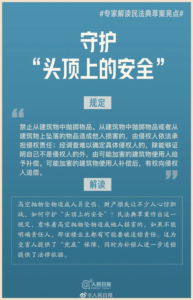 解讀:高空拋物墜物造成人員受傷、財(cái)產(chǎn)損失讓不少人心驚膽戰(zhàn),如何守護(hù)“頭頂上的安全”?民法典草案作出這一規(guī)定,意味著高空拋物墜物造成他人損害的,如果不能明確責(zé)任人,那該樓業(yè)主都有可能要被追償責(zé)任。這為受害人提供了“兜底”保障,同時(shí)為補(bǔ)償人進(jìn)一步追償提供了法律依據(jù)。