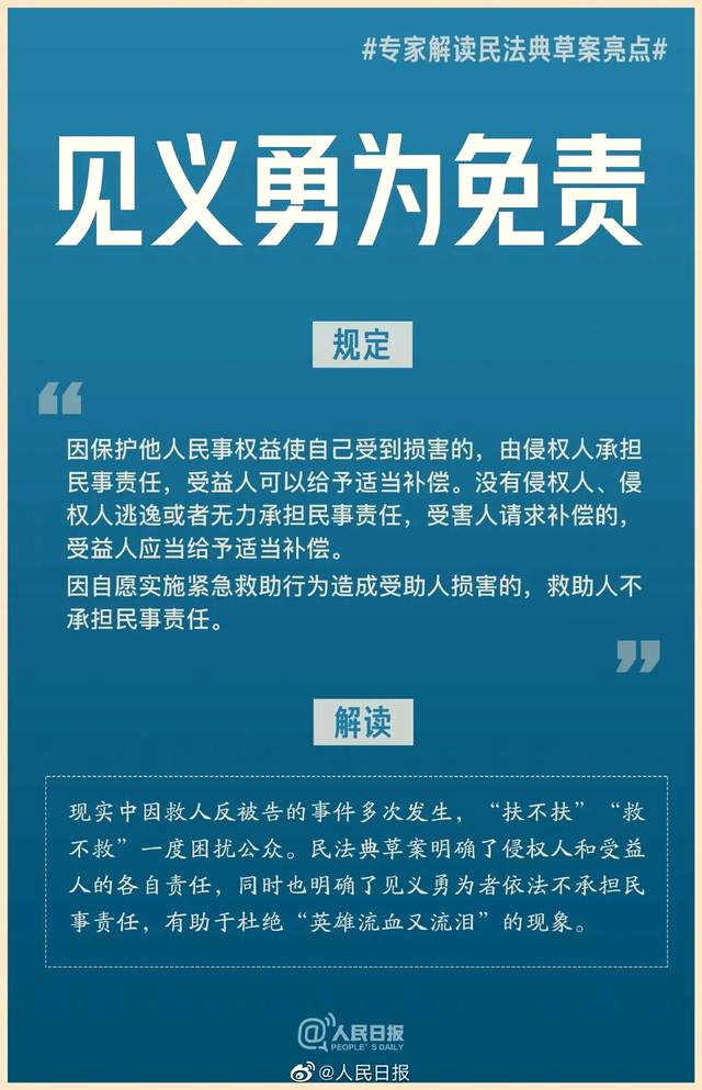 解讀:現(xiàn)實(shí)中因救人反被告的事件多次發(fā)生,“扶不扶”“救不救”一度困擾公眾。民法典草案明確了侵權(quán)人和受益人的各自責(zé)任,同時(shí)也明確了見(jiàn)義勇為者依法不承擔(dān)民事責(zé)任,有助于杜絕“英雄流血又流淚”的現(xiàn)象。
