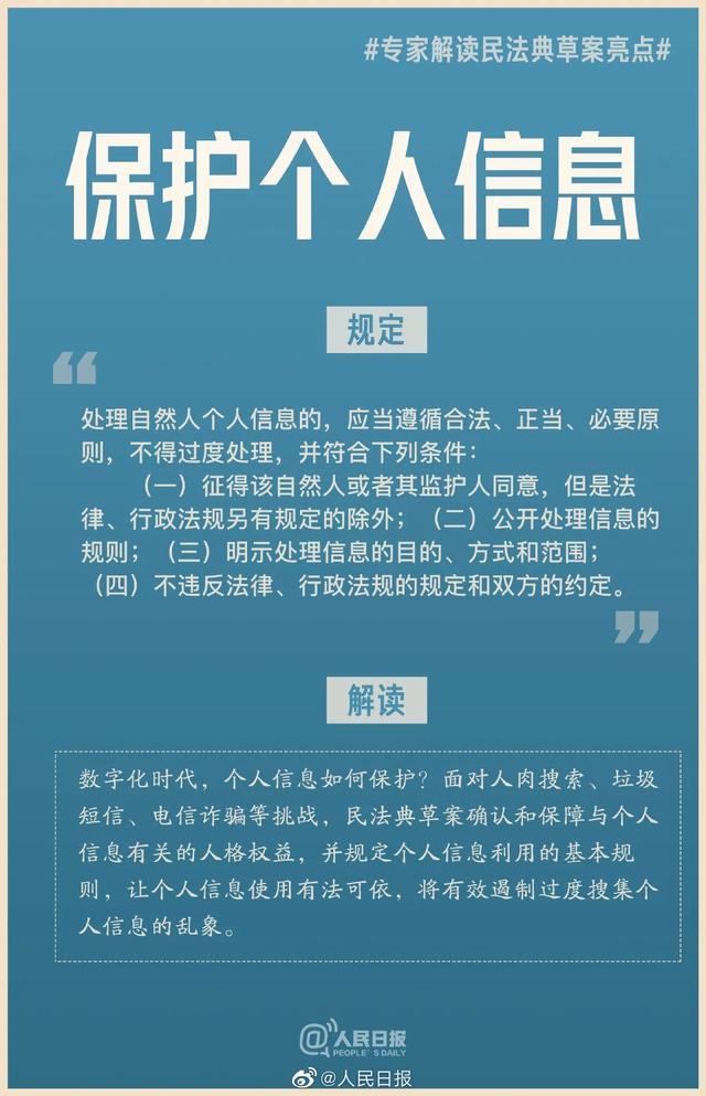 解讀:數(shù)字化時(shí)代,個(gè)人信息如何保護(hù)?面對(duì)人肉搜索、垃圾短信、電信詐騙等挑戰(zhàn),民法典草案確認(rèn)和保障與個(gè)人信息有關(guān)的人格權(quán)益,并規(guī)定個(gè)人信息利用的基本規(guī)則,讓個(gè)人信息使用有法可依,將有效遏制過(guò)度搜集個(gè)人信息的亂象。