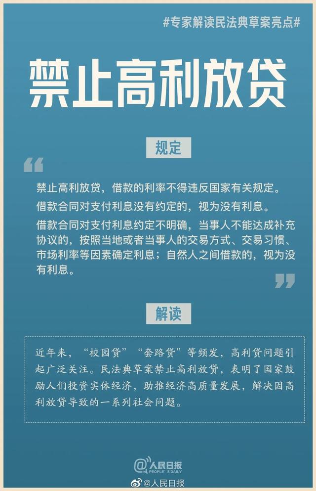 解讀:近年來(lái),“校園貸”“套路貸”等頻發(fā),高利貸問(wèn)題引起廣泛關(guān)注。民法典草案禁止高利放貸,表明了國(guó)家鼓勵(lì)人們投資實(shí)體經(jīng)濟(jì),助推經(jīng)濟(jì)高質(zhì)量發(fā)展,解決因高利放貸導(dǎo)致的一系列社會(huì)問(wèn)題。