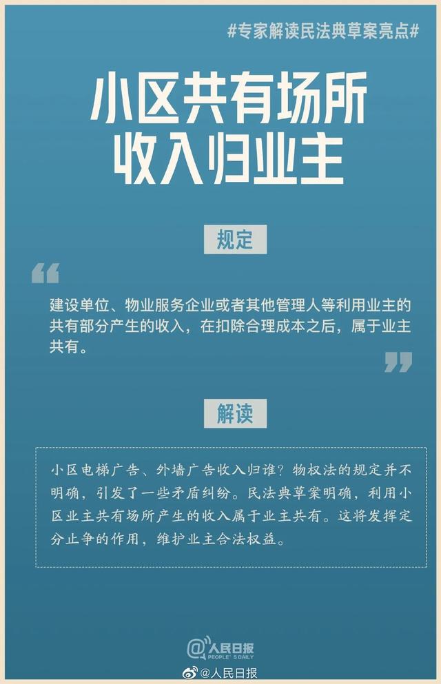 解讀:小區(qū)電梯廣告、外墻廣告收入歸誰(shuí)?物權(quán)法的規(guī)定并不明確,引發(fā)了一些矛盾糾紛。民法典草案明確,利用小區(qū)業(yè)主共有場(chǎng)所產(chǎn)生的收入屬于業(yè)主共有。這將發(fā)揮定分止?fàn)幍淖饔?,維護(hù)業(yè)主合法權(quán)益。