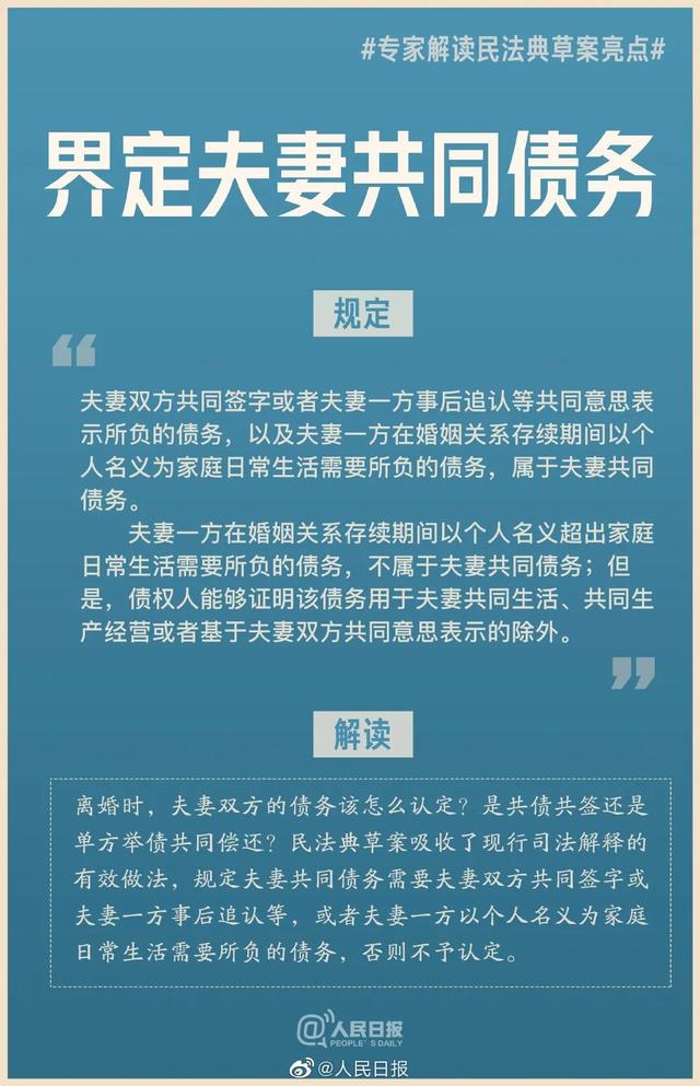 解讀:離婚時(shí),夫妻雙方的債務(wù)該怎么認(rèn)定?是共債共簽還是單方舉債共同償還?民法典草案吸收了現(xiàn)行司法解釋的有效做法,規(guī)定夫妻共同債務(wù)需要夫妻雙方共同簽字或夫妻一方事后追認(rèn)等,或者夫妻一方以個(gè)人名義為家庭日常生活需要所負(fù)的債務(wù),否則不予認(rèn)定。