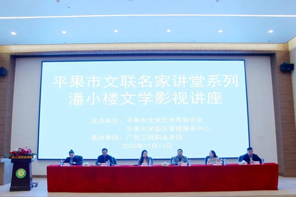 2020年11月13日上午,由平果市文聯(lián)、平果市大學園區(qū)管理服務中心主辦,廣西工程職業(yè)學院承辦,平果市作家協(xié)會協(xié)辦的“平果市文聯(lián)名家講堂系列”之“潘小樓文學影視講座”在我校舉行。平果市作家協(xié)會會員、平果鋁右江源文學社、平果大學園區(qū)各高校文學社團及文學愛好者近300人到場聆聽。
