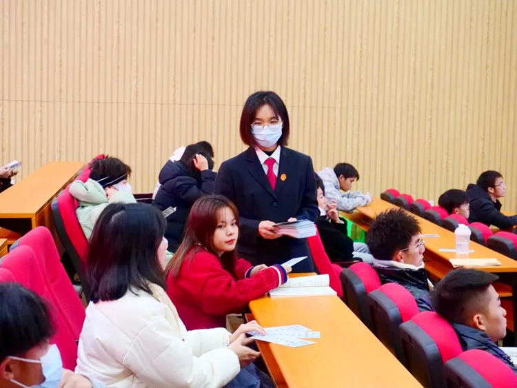 講座現(xiàn)場,平果市人民法院刑事審判庭的工作人員給同學(xué)們分發(fā)防詐騙宣傳冊,讓同學(xué)們對不法分子的詐騙手段有了進(jìn)一步的了解,提高了防范意識。