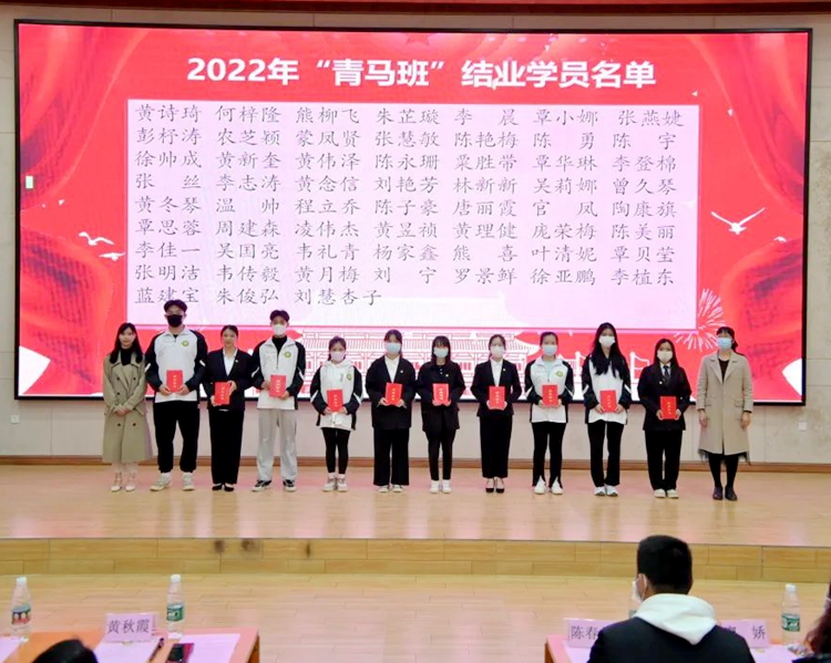 校團委黃詩晴老師宣讀“青馬班”結(jié)業(yè)學員名單和優(yōu)秀學員名單,與會領(lǐng)導老師為優(yōu)秀學員和結(jié)業(yè)學員代表頒獎。