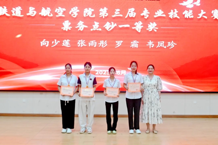 李婷老師為榮獲票務(wù)點鈔技能賽項二等獎的學(xué)生頒獎