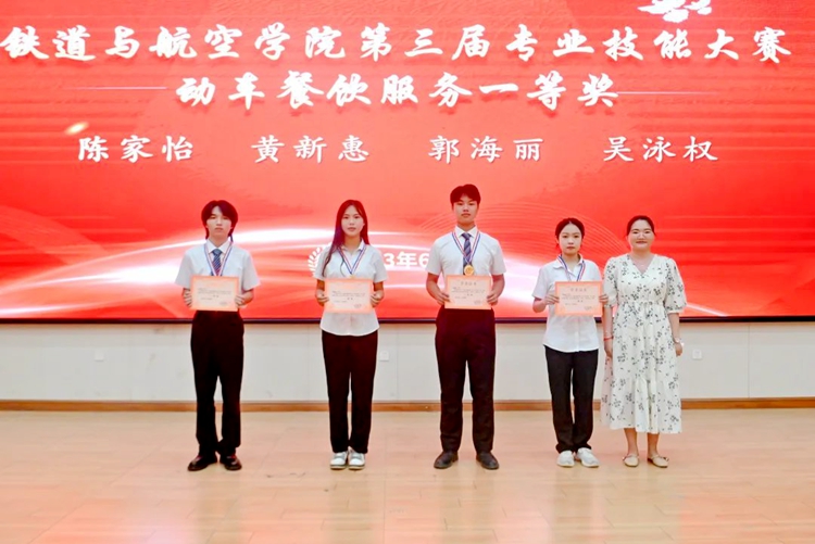 黃典榮老師為榮獲動車餐飲托盤服務(wù)賽項一等獎的學(xué)生頒獎