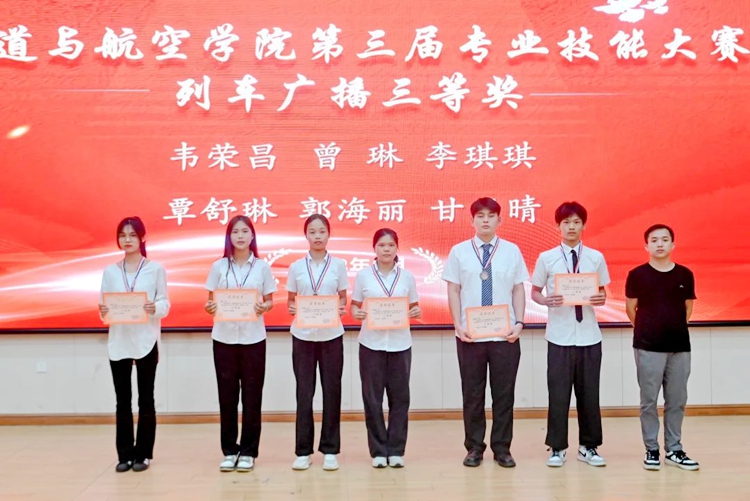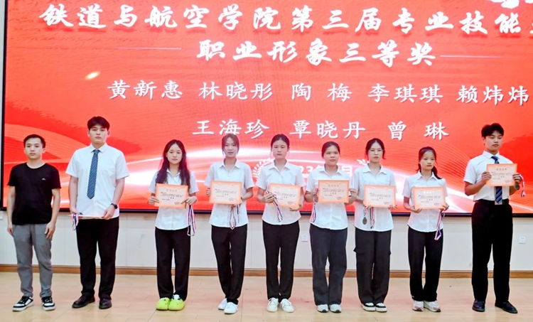 鐵道與航空學(xué)院辦公室主任黃晶晶宣讀第三屆專業(yè)技能大賽獲獎名單,出席頒獎典禮的領(lǐng)導(dǎo)、老師分別為獲獎選手頒獎。