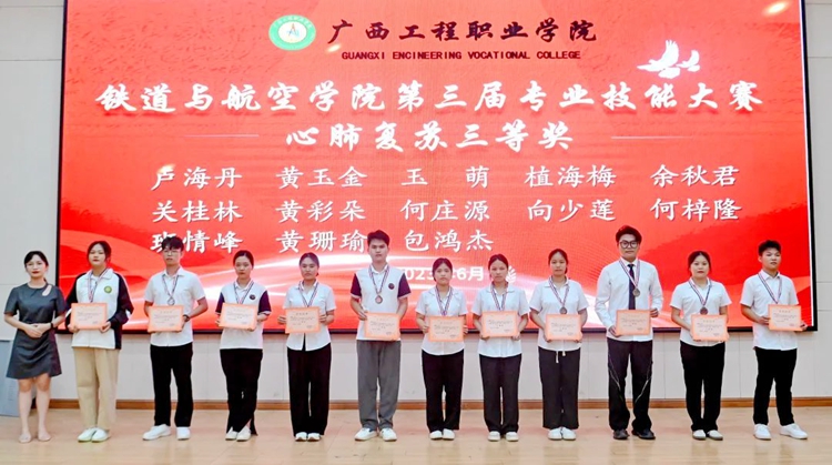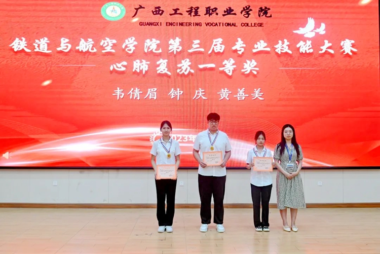 鐵道與航空學(xué)院辦公室主任黃晶晶為榮獲心肺復(fù)蘇賽項一等獎的學(xué)生頒獎