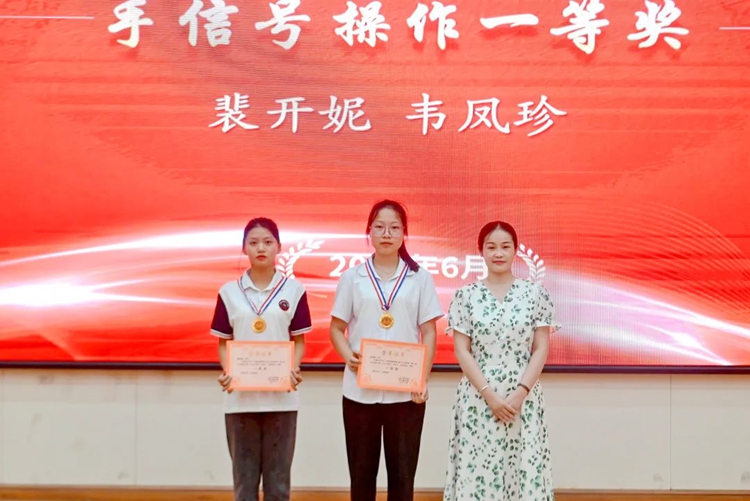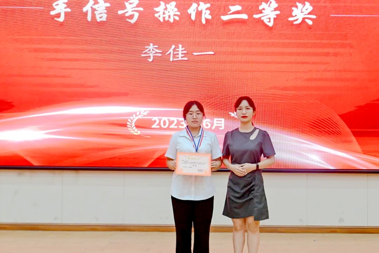 徐琳老師為榮獲手信號操作賽項一等獎的學(xué)生頒獎