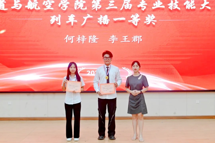 梁春雨老師為榮獲列車廣播賽項一等獎的學(xué)生頒獎