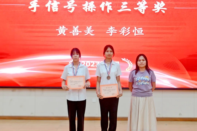 韋丹蕾老師為榮獲手信號操作賽項三等獎的學(xué)生頒獎