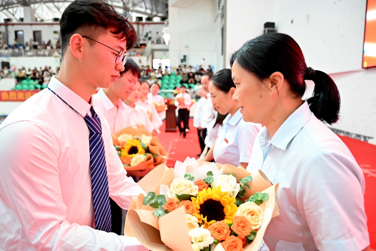 畢業(yè)生代表為學校領導、老師獻上感恩的花束
