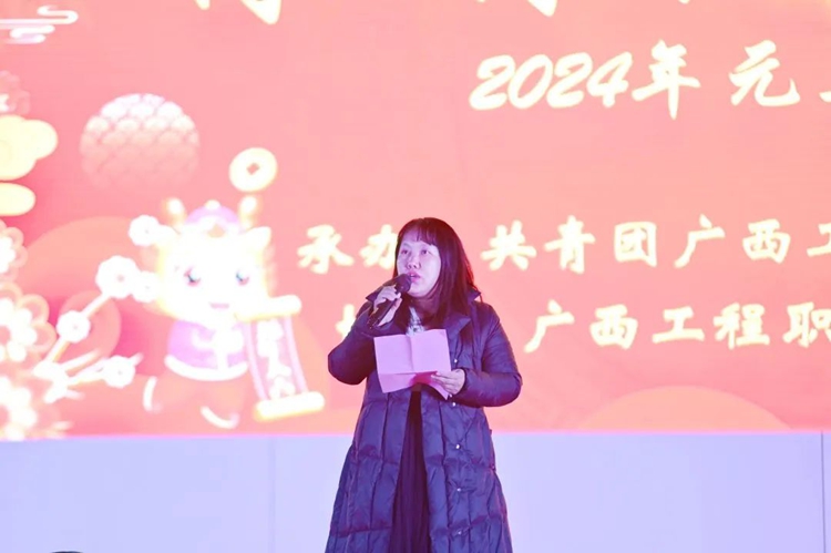 晚會(huì)伊始,校長羅艷妮致辭,她深情回顧了過去一年學(xué)校辦學(xué)取得的成績,對(duì)新的一年做出美好展望,激勵(lì)全體師生在新的一年里成為更好的自己,共同致力于學(xué)校的高質(zhì)量發(fā)展,繼續(xù)奔跑在奮斗之路上,用廣工程院人的“奮進(jìn)之筆”繼續(xù)書寫新時(shí)代幸福美好廣西工程職業(yè)學(xué)院的優(yōu)異答卷。