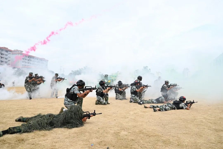 戰(zhàn)士們頭戴防毒面具、手握仿真槍,在“硝煙”中隱蔽偵查,沖鋒突擊、格擋、抱摔,深入“敵區(qū)”成功解救“人質(zhì)”,緊密的戰(zhàn)術(shù)動(dòng)作,精準(zhǔn)的指揮巧妙地躲避著“敵人”的攻擊。