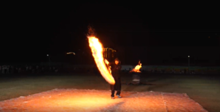 鋒利的火刀在表演者手中被賦予別樣生機(jī),他們熟練地?fù)]舞、翻轉(zhuǎn)火刀,火焰在刀身燃燒跳躍。