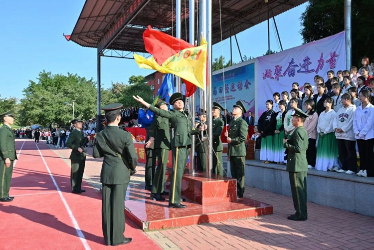師生們面向國旗行注目禮,鮮艷的五星紅旗冉冉升起,點燃了運(yùn)動健兒們的朝氣與熱情。
