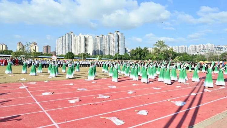 禮炮隨即齊響,繽紛的禮花漫天飛揚(yáng),現(xiàn)場掌聲不斷,運(yùn)動會正式拉開序幕,下面是文藝表演。