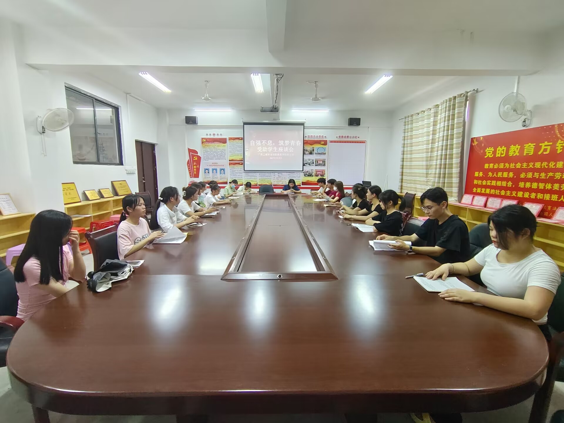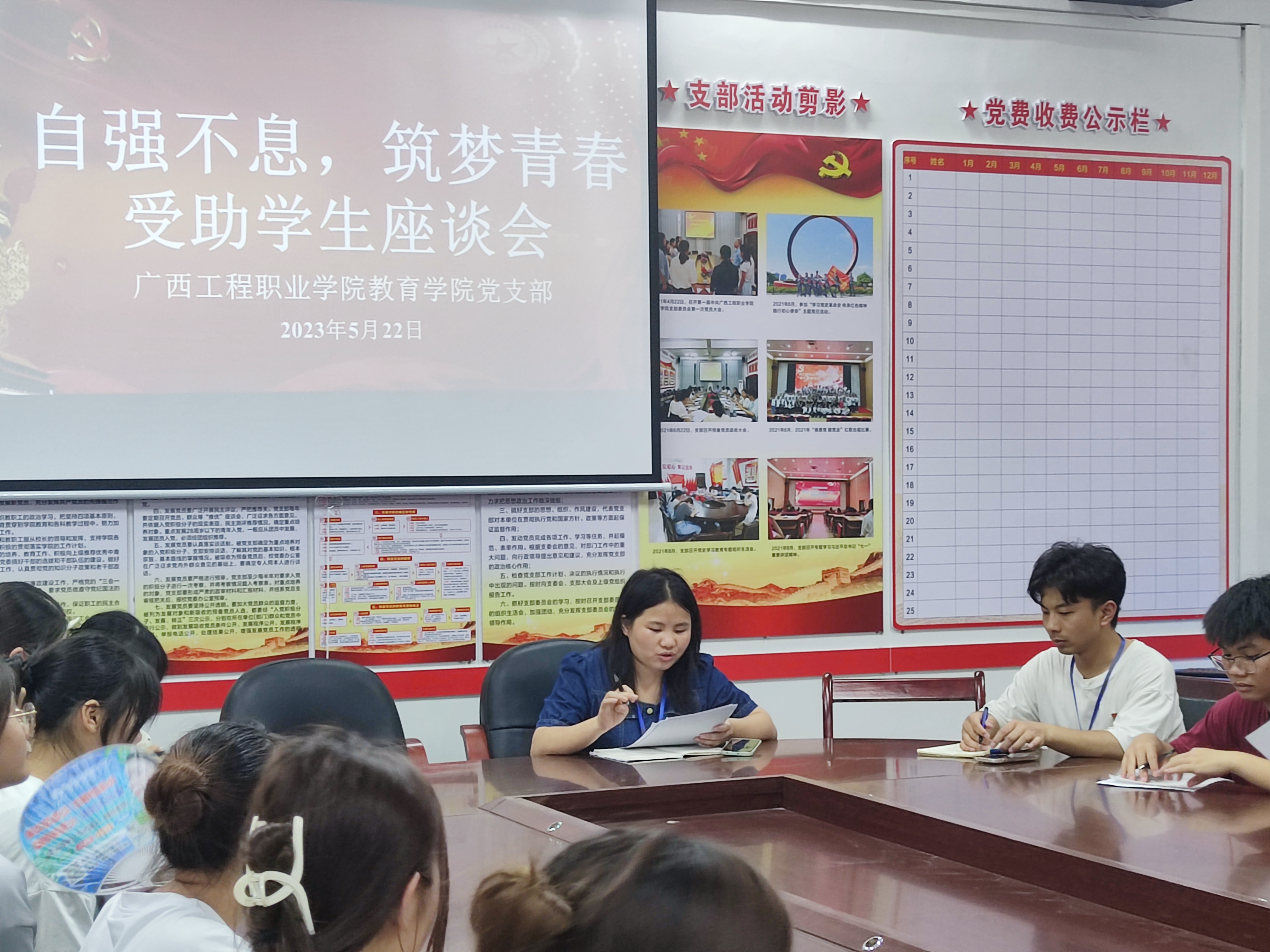 為響應(yīng)學校開展資助政策宣傳月活動的號召,進一步加強大學生資助政策宣傳力度,實施精準資助,幫助貧困學生安心讀書,培育受助學生的愛黨愛國愛校的情感和感恩意識,確保國家學生資助政策家喻戶曉、深入人心。為了充分發(fā)揮受助學生在學習生活等方面的榜樣作用,激勵更多的同學奮發(fā)向上、爭先創(chuàng)優(yōu),建設(shè)更美好的校園。廣西工程職業(yè)學院教育學院黨支部于2023年5月22日在教育學院黨員活動室組織召開“自強不息,筑夢青春”受助學生座談會。