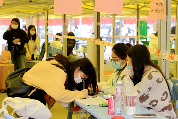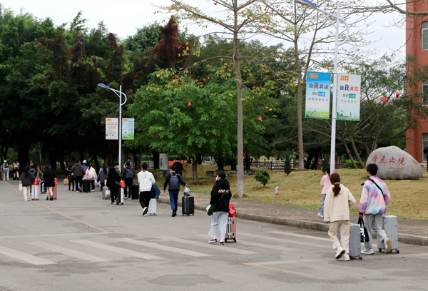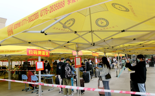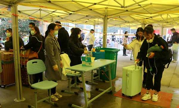 學(xué)生返校當(dāng)天,學(xué)校在校門口搭建了臨時帳篷,劃分了“汽車停放區(qū)”“排隊等候區(qū)”“掃碼區(qū)”“體溫測量區(qū)”“行李消殺區(qū)”“返校資料審核區(qū)”等多個區(qū)域,并開通了多條通道方便學(xué)生有序返校。學(xué)生配合疫情防控查驗(yàn),有序排隊,進(jìn)行體溫篩查,出示健康“綠碼”,進(jìn)行行李消殺和核驗(yàn)返校材料信息無誤后,簽到注冊、上交相關(guān)材料,安全進(jìn)入校園。學(xué)校還貼心安排了觀光車,幫助學(xué)生運(yùn)送行李至宿舍樓。