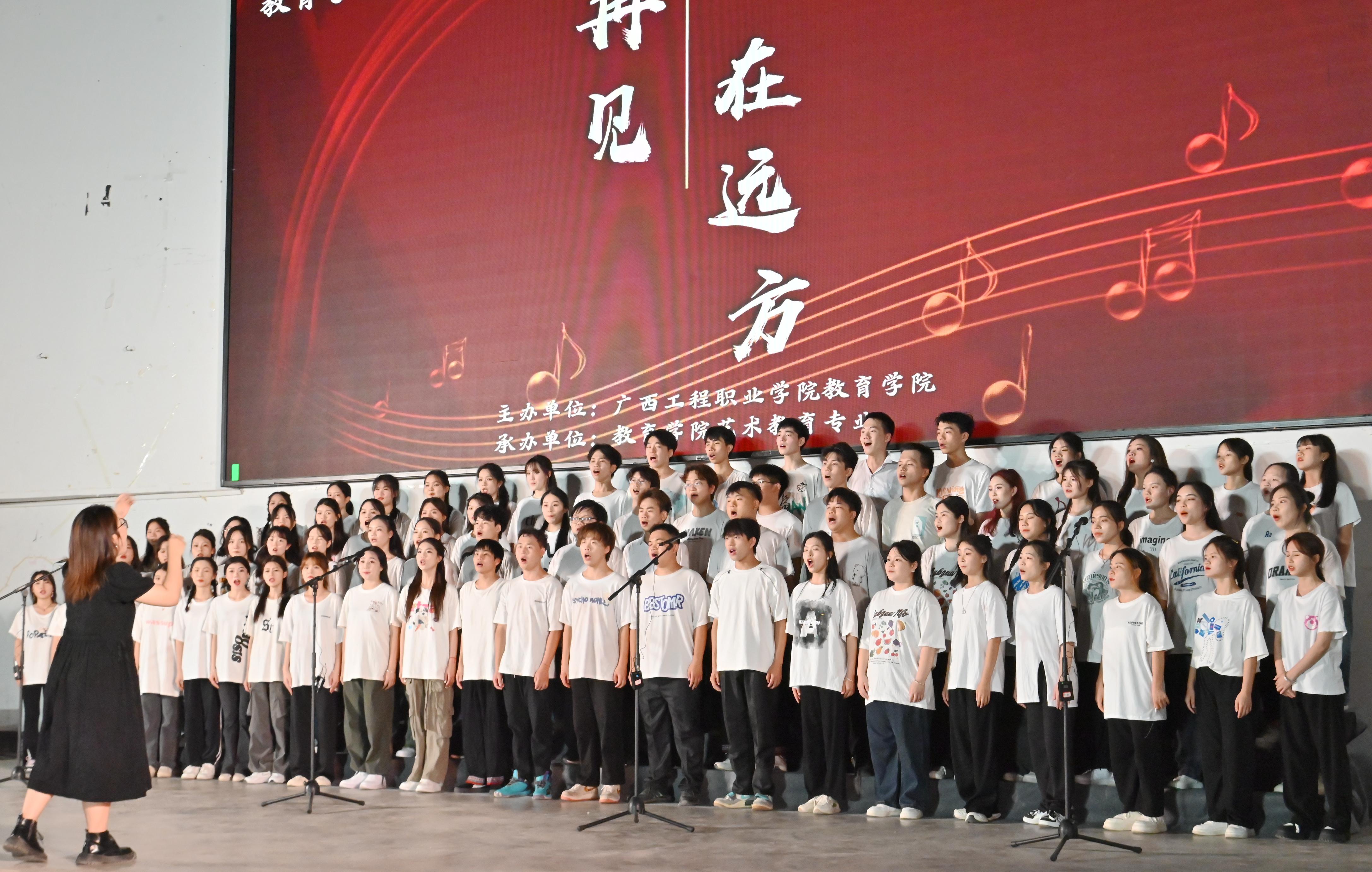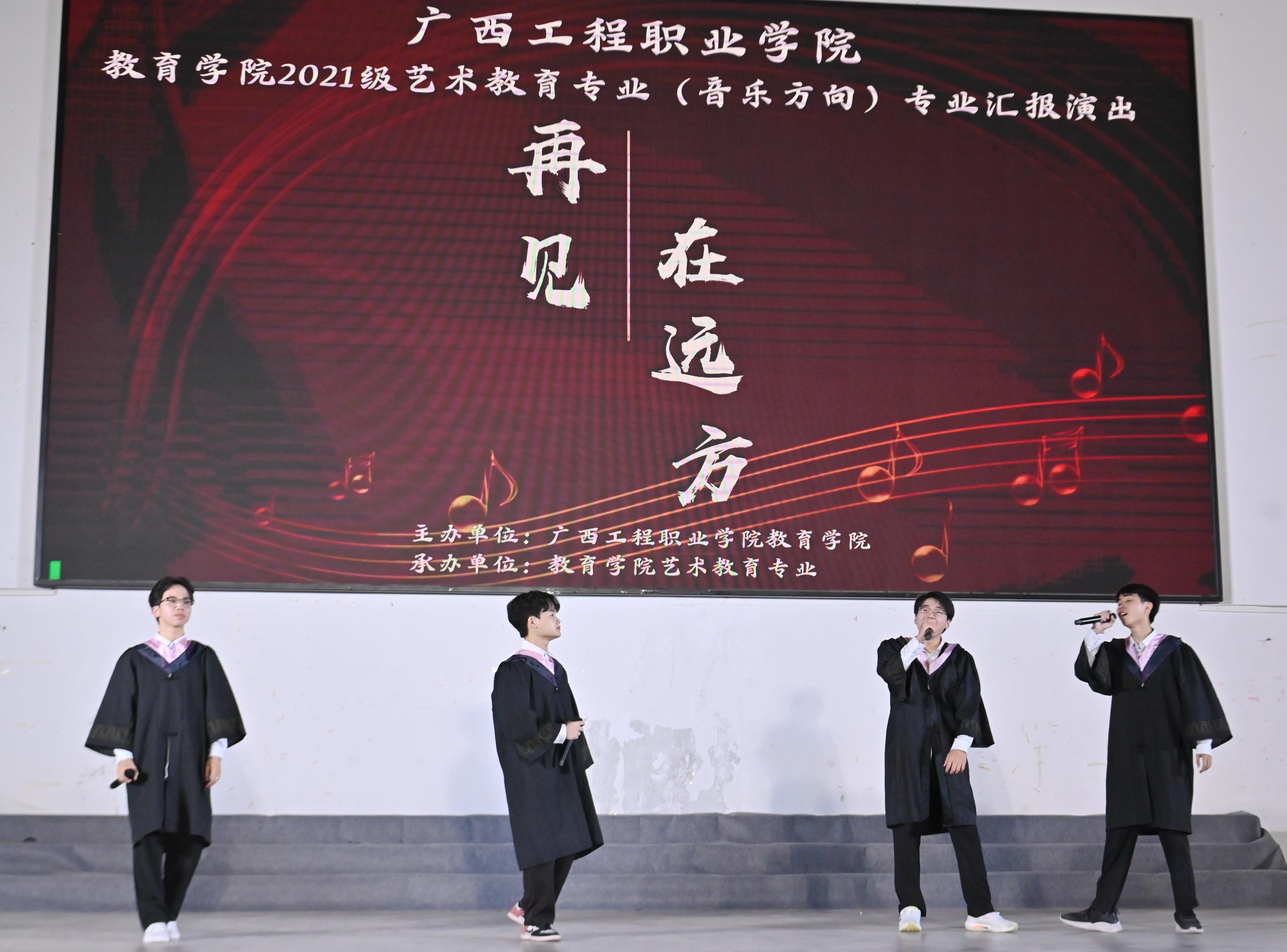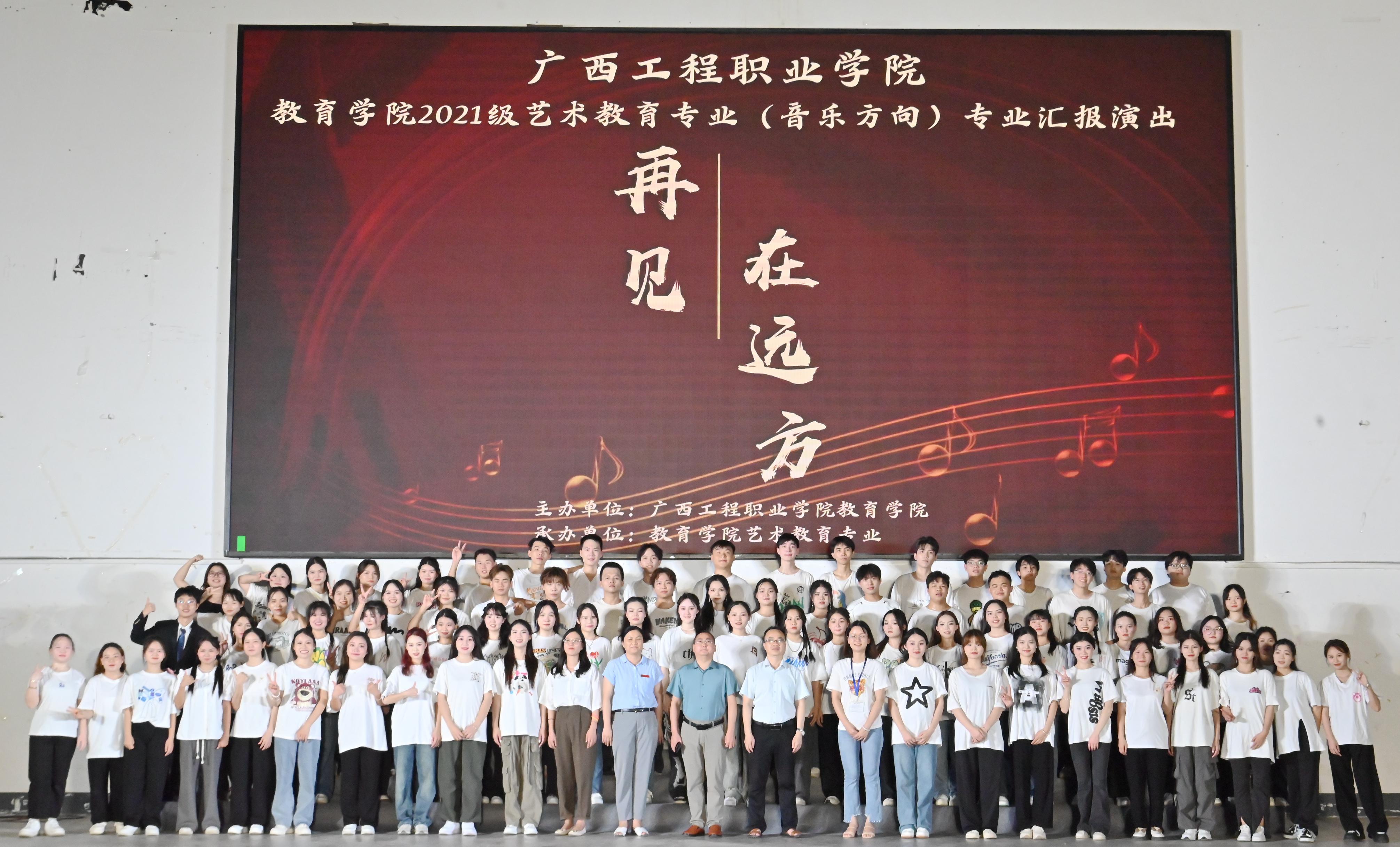 歲月流逝,飛馳的時(shí)光帶不走永恒的夢(mèng)想。時(shí)光荏苒,流逝的歲月?lián)]不去執(zhí)著的信念。2023年6月12日晚7點(diǎn)半,教育學(xué)院2021級(jí)藝術(shù)教育專業(yè)(音樂方向)“再見·在遠(yuǎn)方”專業(yè)匯報(bào)演出在體育館舉行。學(xué)校紀(jì)委書記、副校長彭高彬,副校長吳先夏,學(xué)校校長助理梁善雅,教育學(xué)院院長梁鳳琴等師生觀看了本場(chǎng)晚會(huì)。
