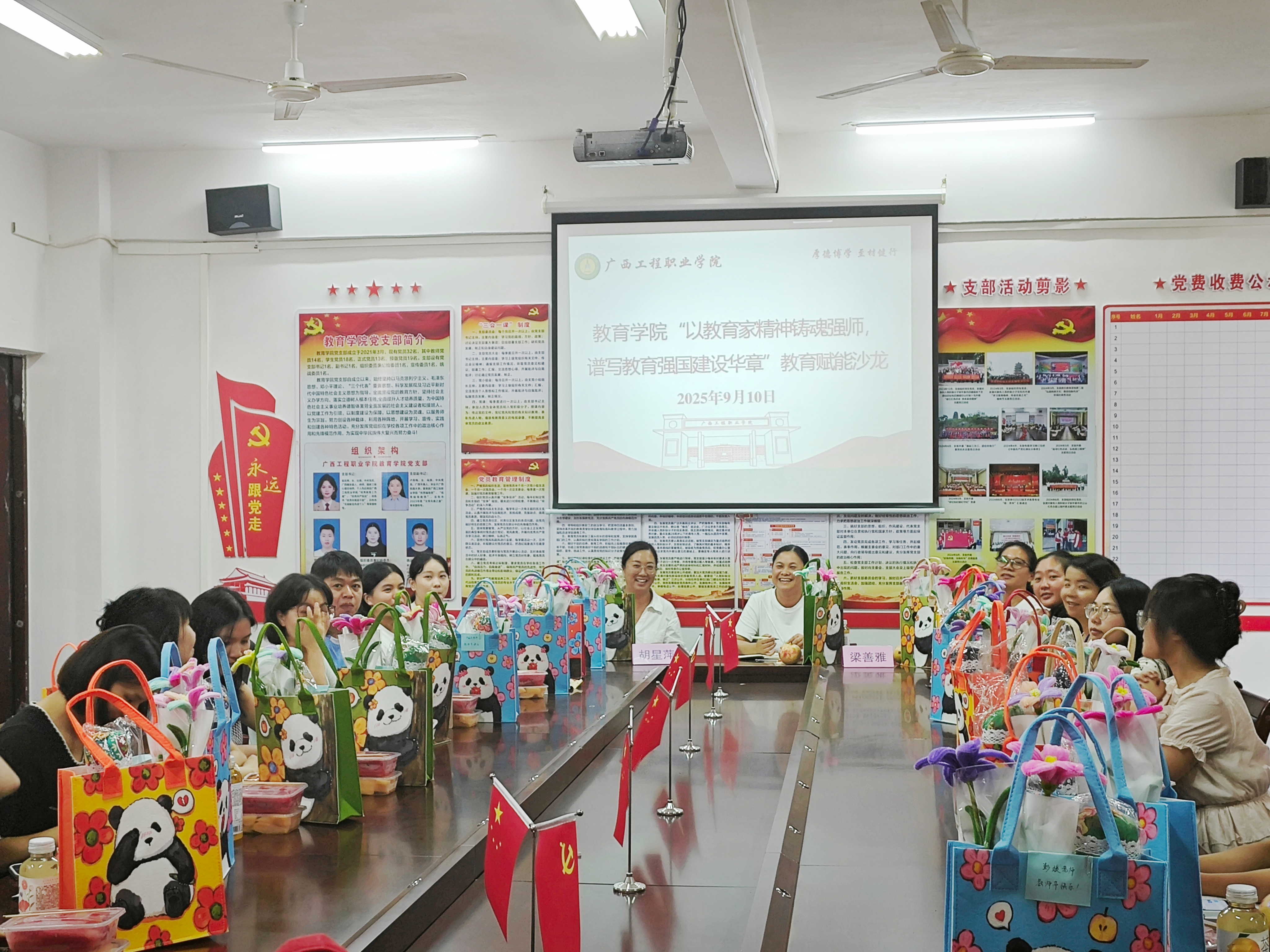 2025年9 月 10 日,廣西工程職業(yè)學(xué)院教育學(xué)院于學(xué)院601會(huì)議室舉辦主題為 “以教育家精神鑄魂強(qiáng)師?譜寫(xiě)教育強(qiáng)國(guó)建設(shè)華章” 的第 41 個(gè)教師節(jié)教育賦能沙龍座談會(huì)。學(xué)校校長(zhǎng)助理梁善雅、學(xué)院院長(zhǎng)胡星萍、辦公室主任雷紅、黨支部書(shū)記楊小櫻、學(xué)生科長(zhǎng)佴蕊以及教育學(xué)院全體教師出席座談會(huì)?;顒?dòng)伊始,學(xué)院領(lǐng)導(dǎo)發(fā)表講話,強(qiáng)調(diào)教育家精神對(duì)教育工作者的重要引領(lǐng)作用,鼓勵(lì)教師們?cè)诮逃龔?qiáng)國(guó)建設(shè)中積極作為。?