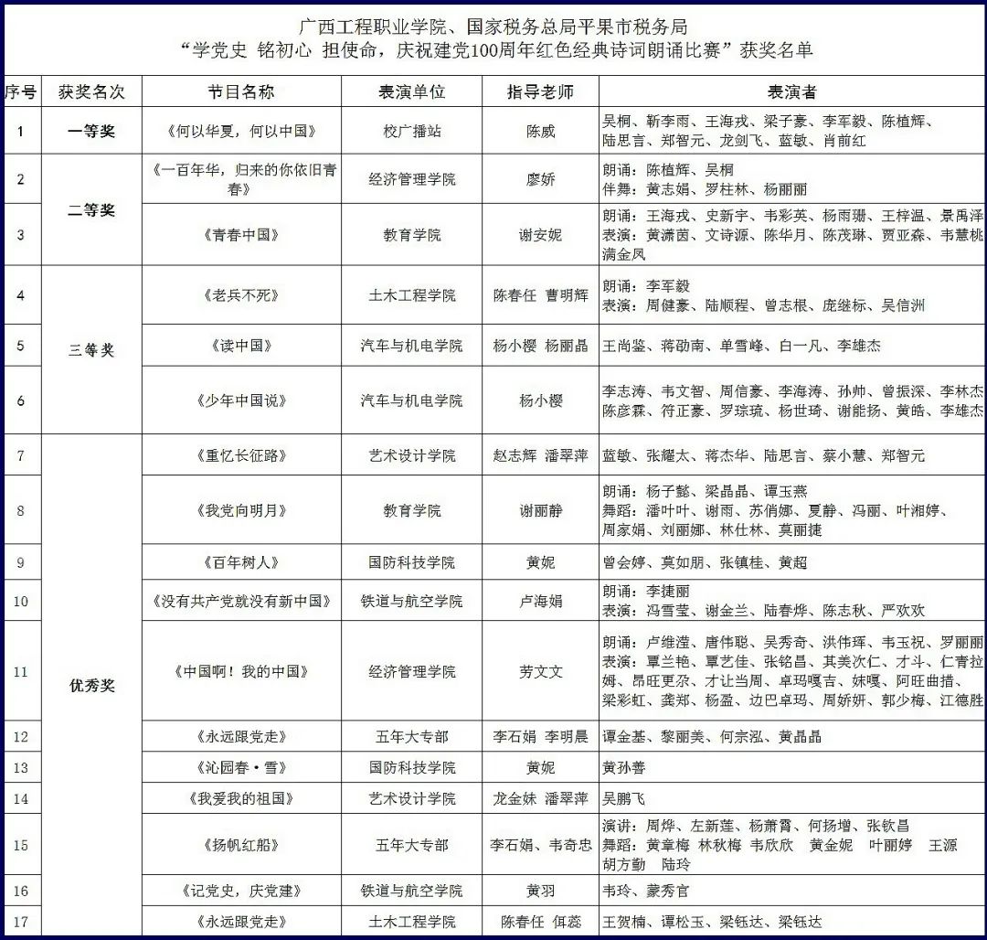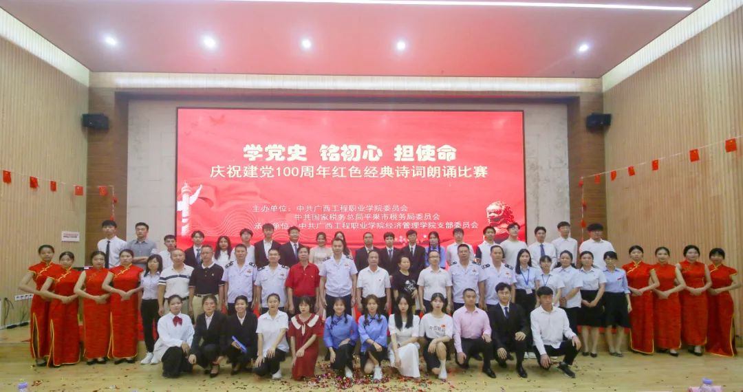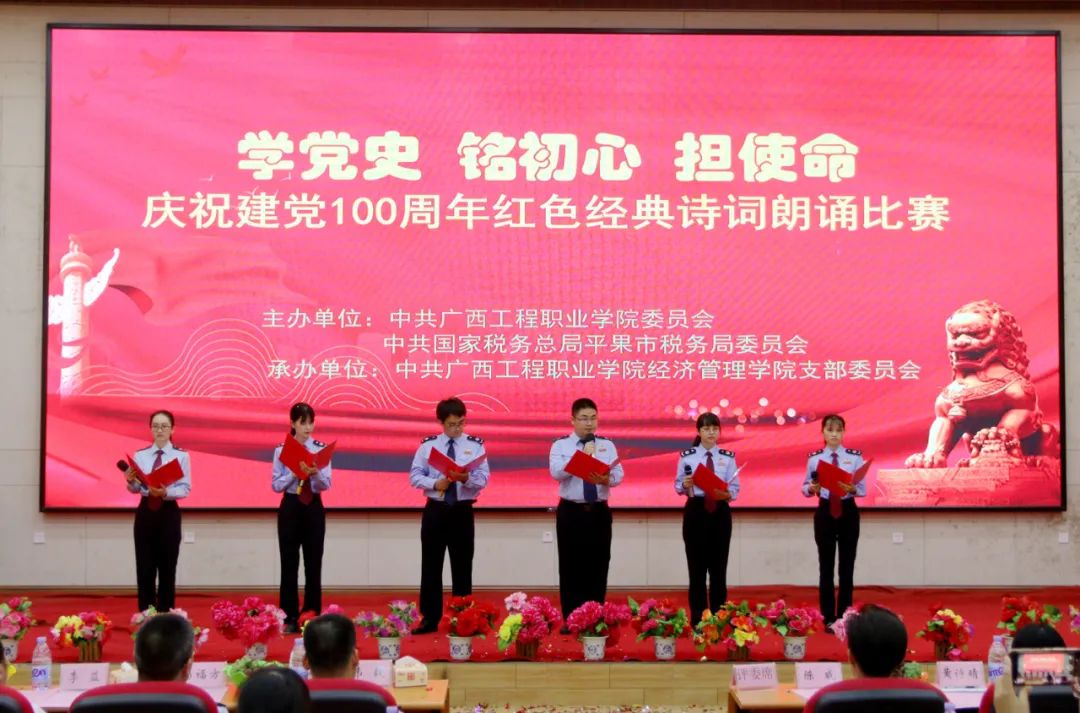 為慶祝中國(guó)共產(chǎn)黨成立100周年,傳承紅色基因,賡續(xù)共產(chǎn)黨人精神血脈,進(jìn)一步激發(fā)大學(xué)生的愛(ài)黨愛(ài)國(guó)愛(ài)社會(huì)主義情懷。6月29日晚,由中共廣西工程職業(yè)學(xué)院委員會(huì)、中共國(guó)家稅務(wù)總局平果市稅務(wù)局委員會(huì)聯(lián)合主辦,中共廣西工程職業(yè)學(xué)院經(jīng)濟(jì)管理學(xué)院支部委員會(huì)承辦的“學(xué)黨史、銘初心、擔(dān)使命,慶祝建黨100周年紅色經(jīng)典詩(shī)詞朗誦比賽在學(xué)校圖文信息大樓報(bào)告廳舉行。