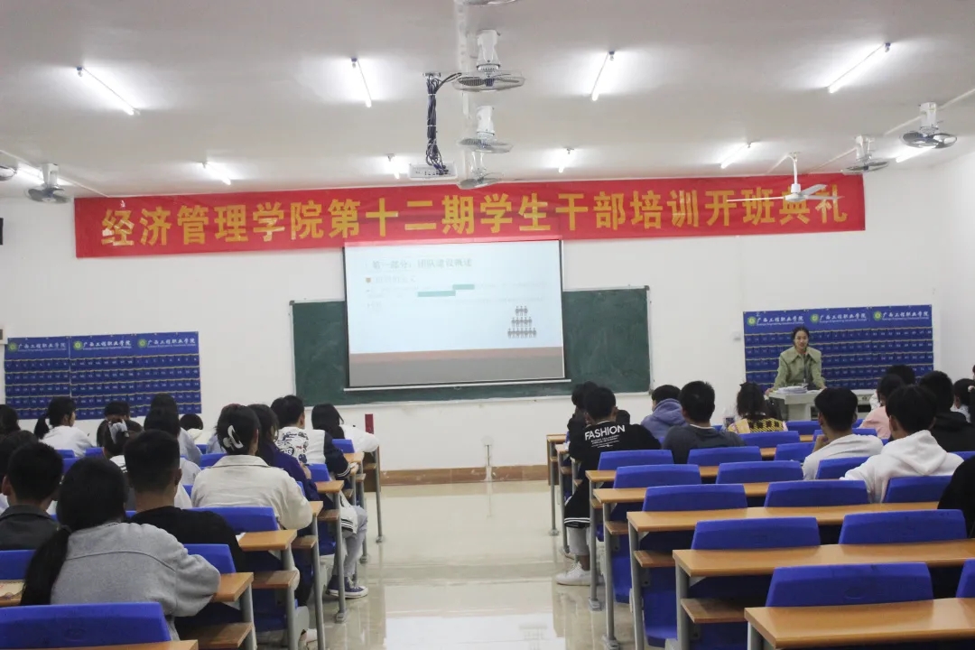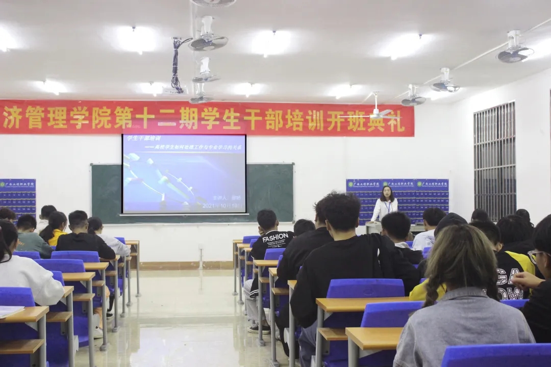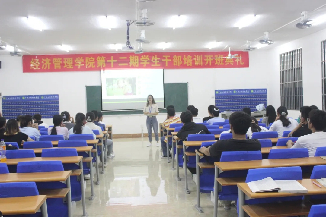 學(xué)校校長助理黃秋霞,經(jīng)濟管理學(xué)院黨支部書記、副院長覃清香,經(jīng)濟管理學(xué)院辦公室主任雷紅、分團委書記李東英及輔導(dǎo)員、專職老師代表出席開班儀式,經(jīng)濟管理學(xué)院2021級全體學(xué)生干部參加培訓(xùn)。