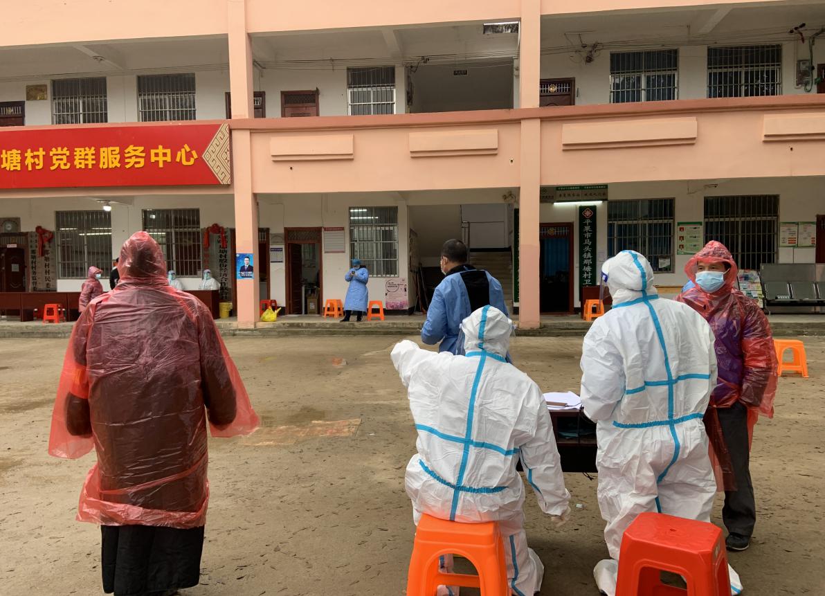 21級(jí)市場(chǎng)1班何忠先,在平果市果化填布榮村平果市馬頭鎮(zhèn)那塘村負(fù)責(zé)協(xié)助核酸檢測(cè)的醫(yī)護(hù)人員進(jìn)行掃碼錄入個(gè)人信息。