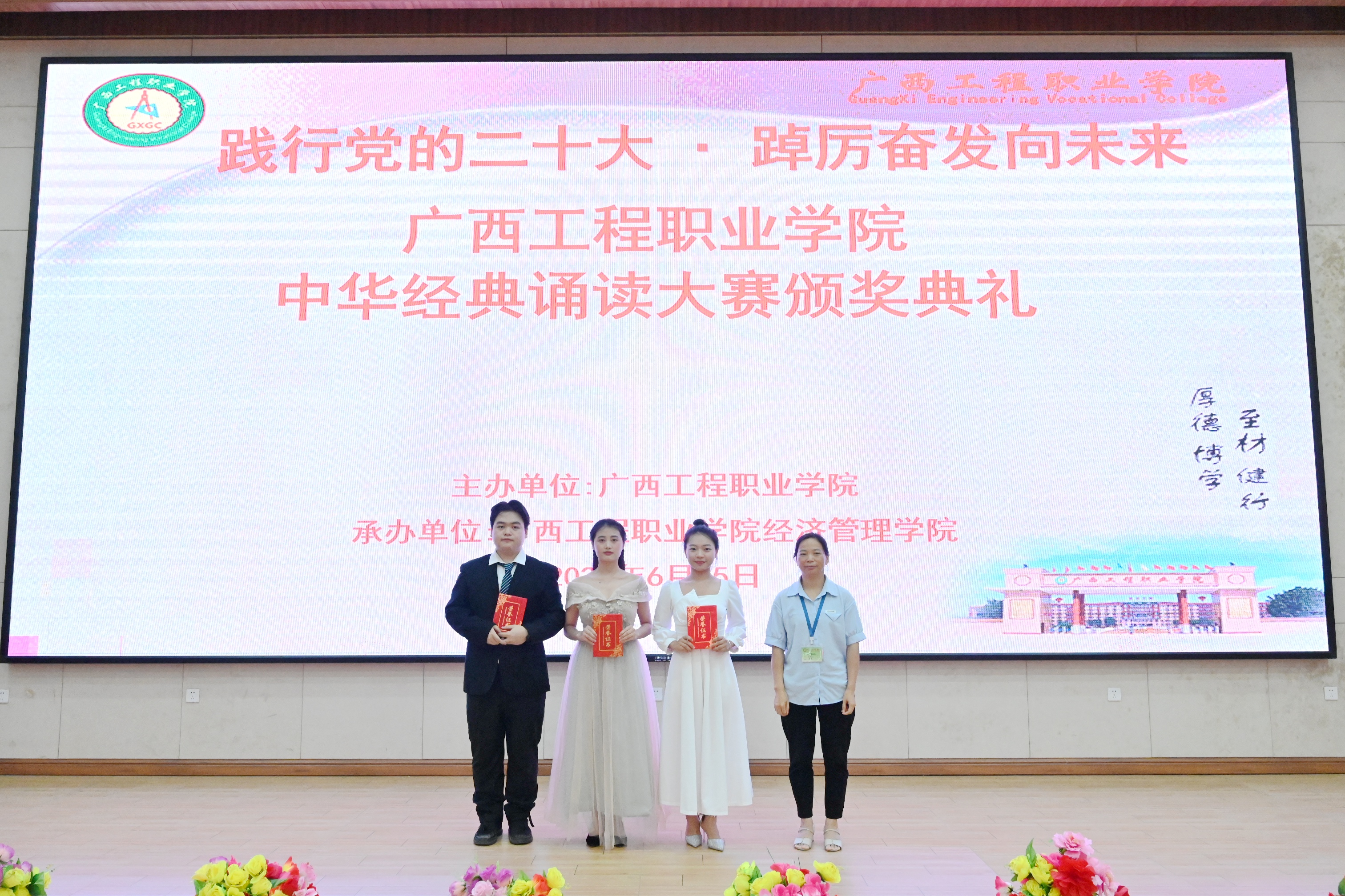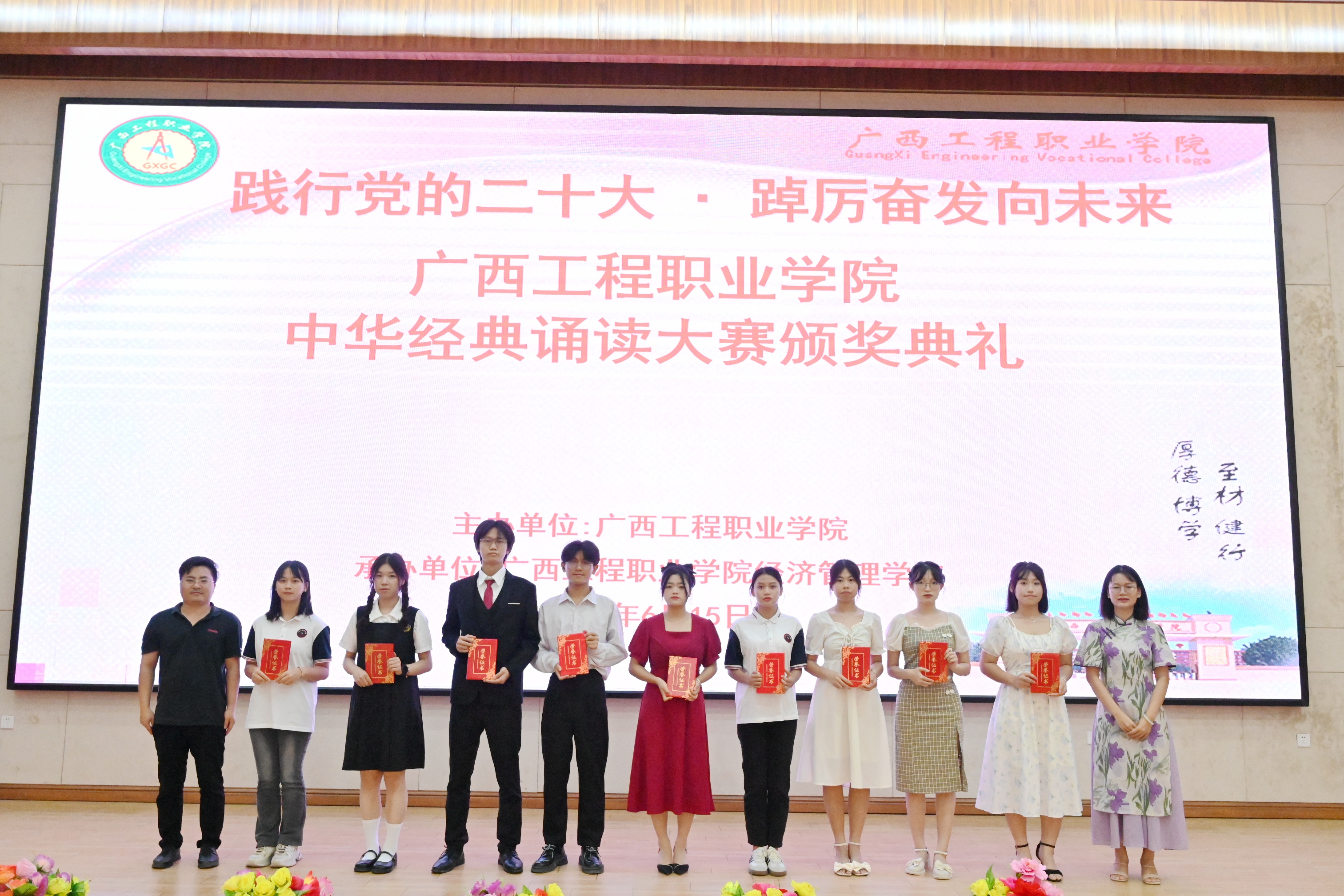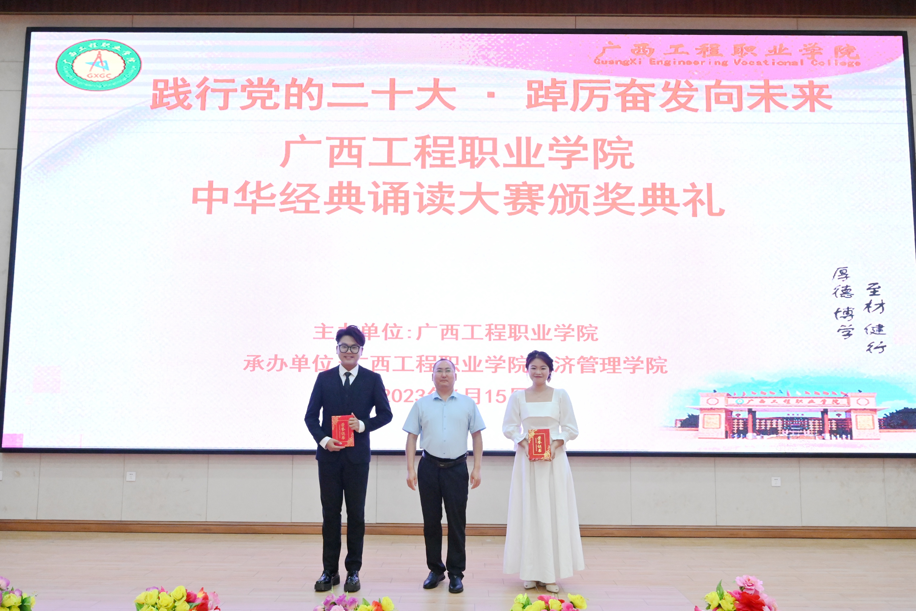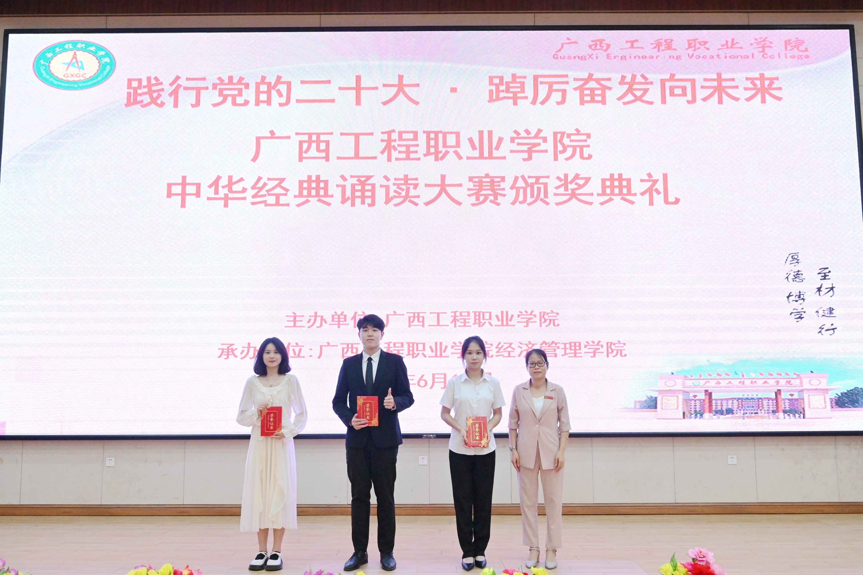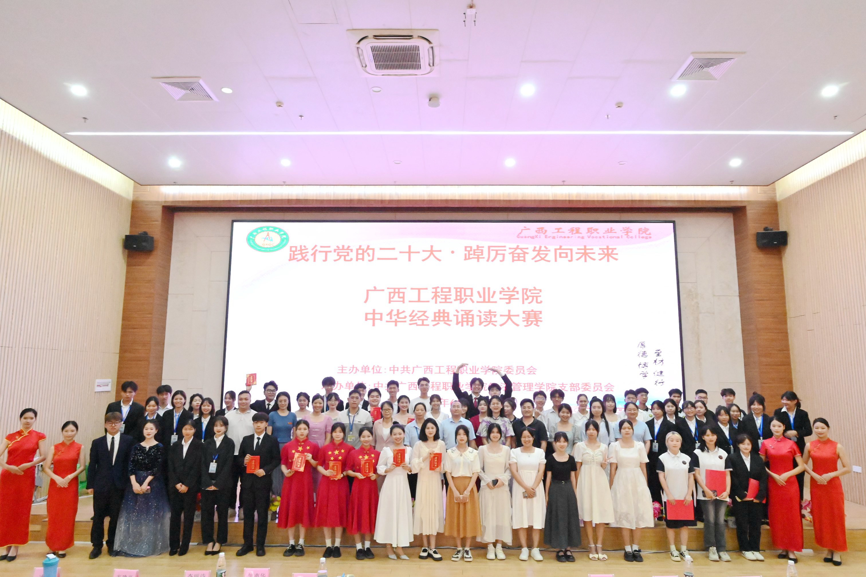 為深入貫徹黨的二十大精神,加大國家通用語言文字推廣力度,弘揚中華優(yōu)秀傳統(tǒng)文化,推進文化自信自強。以中華經典、紅色文化鑄魂育人,奏響愛黨、愛國、愛社會主義的主旋律,鑄牢中華民族共同體意識,凝聚奮進新征程、建功新時代的磅礴力量。2023年6月15日晚,廣西工程職業(yè)學院在圖文信息大樓一樓學術報告大廳舉行“踐行黨的二十大·踔厲奮發(fā)向未來”校園中華經典誦讀大賽比賽,由中共廣西工程職業(yè)學院委員會主辦,中共廣西工程職業(yè)學院經濟管理學院支部委員會承辦。