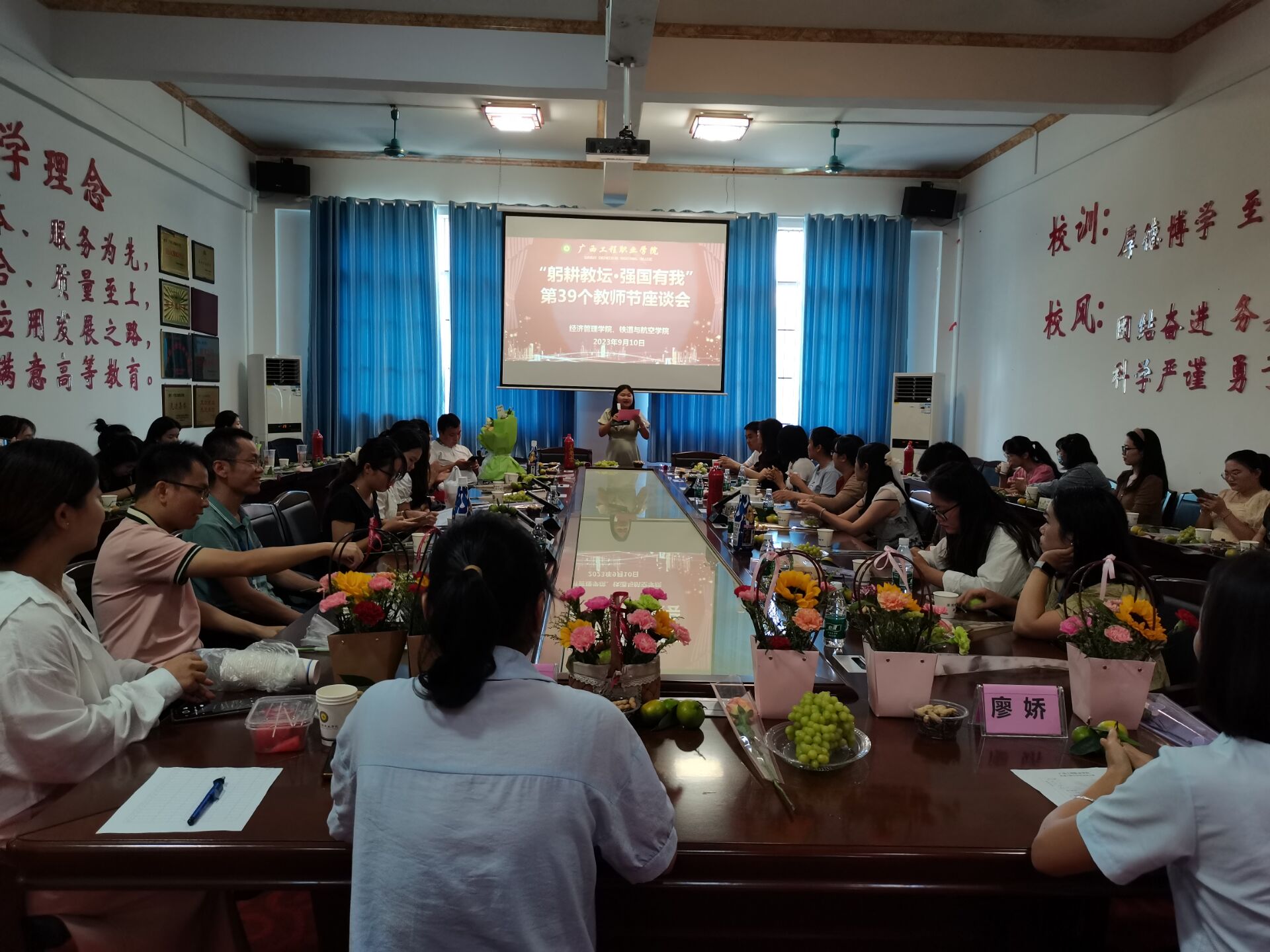 三尺講臺一畝田,種桃種李種春風(fēng)。尋著丹桂的香氣,秋日的鐘聲響起;沿著橘色的云邊,九月的麥浪翻騰。9月10日,經(jīng)濟(jì)管理學(xué)院和鐵道與航空學(xué)院在圖書館一樓會議室聯(lián)合舉行“躬耕教壇·強國有我”教師節(jié)座談會。參加此次座談會的有:經(jīng)濟(jì)管理學(xué)院黨支部書記、院長龐英連,鐵道與航空學(xué)院副院長廖嬌,以及兩個學(xué)院的全體教師。