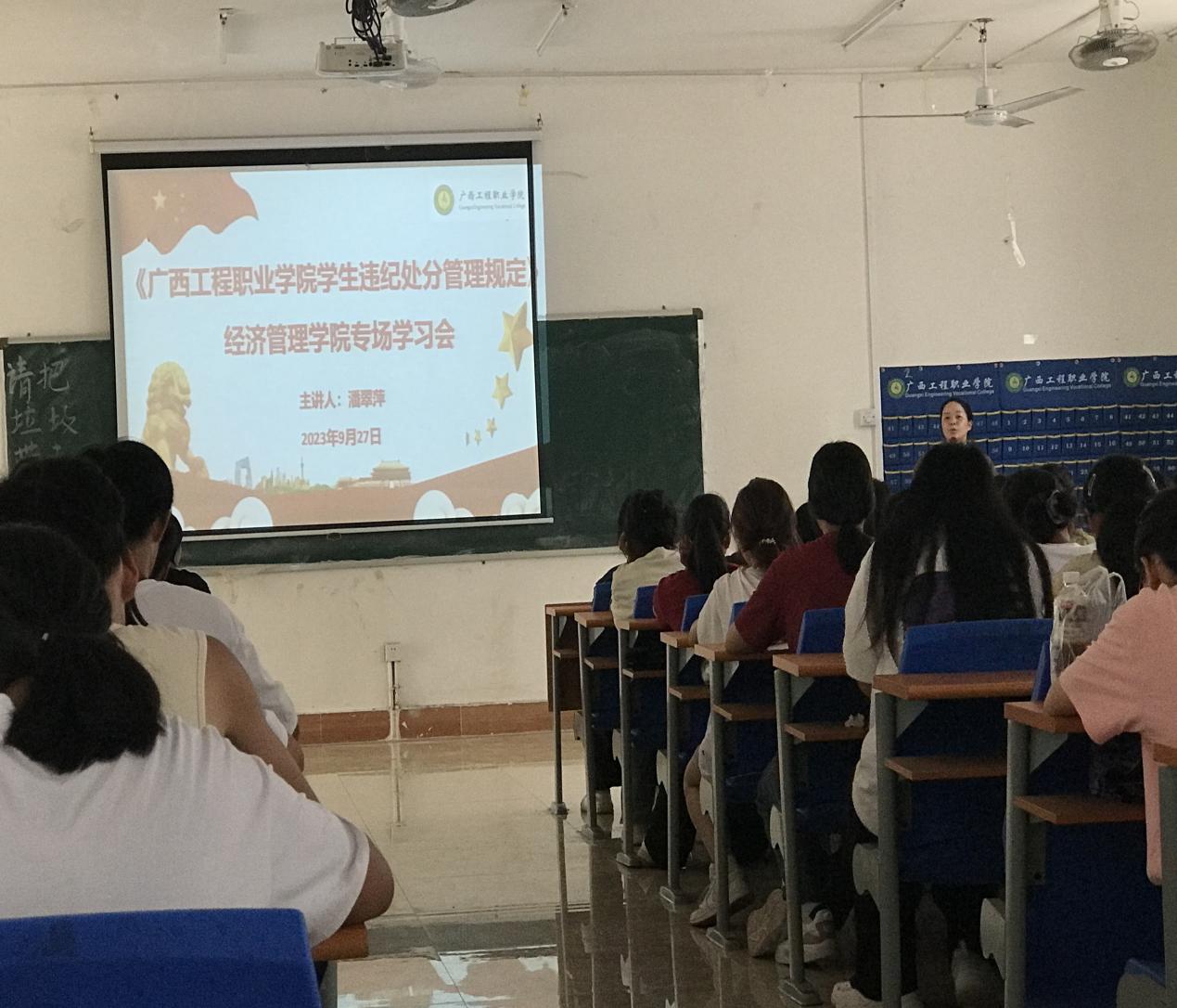 為全面貫徹黨的教育方針,維護學校正常的教學、生活秩序,從嚴治校,促進學生成為有理想、有道德、有文化、有紀律的社會主義事業(yè)接班人。同時也讓2023級新生能快速了解學校管理規(guī)定,知曉學校管理紅線和底線。根據(jù)學校入學教育課程計劃,結(jié)合學院實際,學院于2023年9月27日下午在經(jīng)濟管理學院102教室開展主題為《廣西工程職業(yè)學院學生違紀處分管理規(guī)定》的專題培訓。本次培訓由經(jīng)濟管理學院黨支部副書記潘翠萍老師做專題培訓。