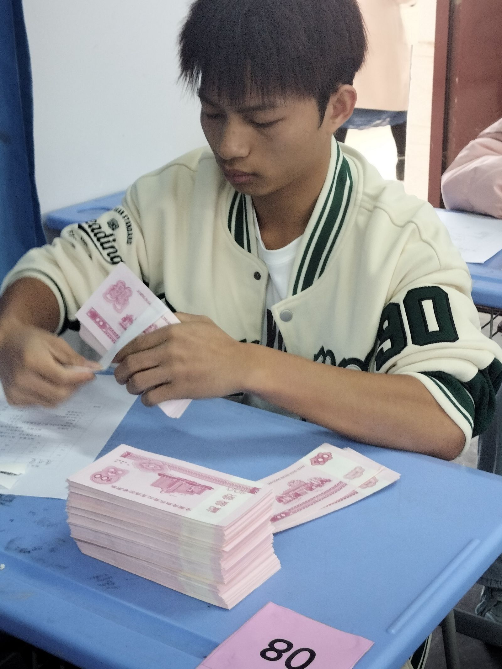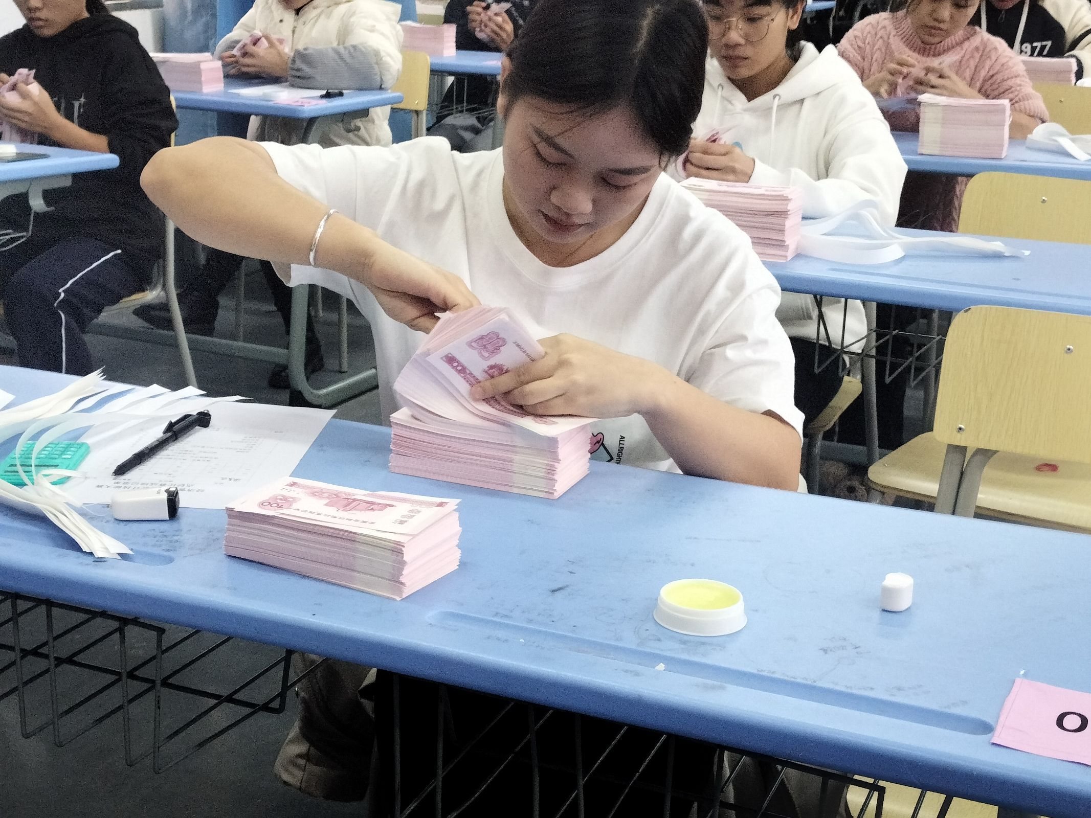 點(diǎn)鈔比賽項(xiàng)目中選手們通過(guò)撥、滑、挑、摞,電光火石間數(shù)十張點(diǎn)鈔券于指尖滑落,手指對(duì)鈔券的攻勢(shì)愈發(fā)猛烈,有三指劃出,有五指并用,也有二指游溯,空氣在這一刻似乎都凝固了。同學(xué)們于指尖和鈔券間點(diǎn)燃激情,競(jìng)攀速度之巔。