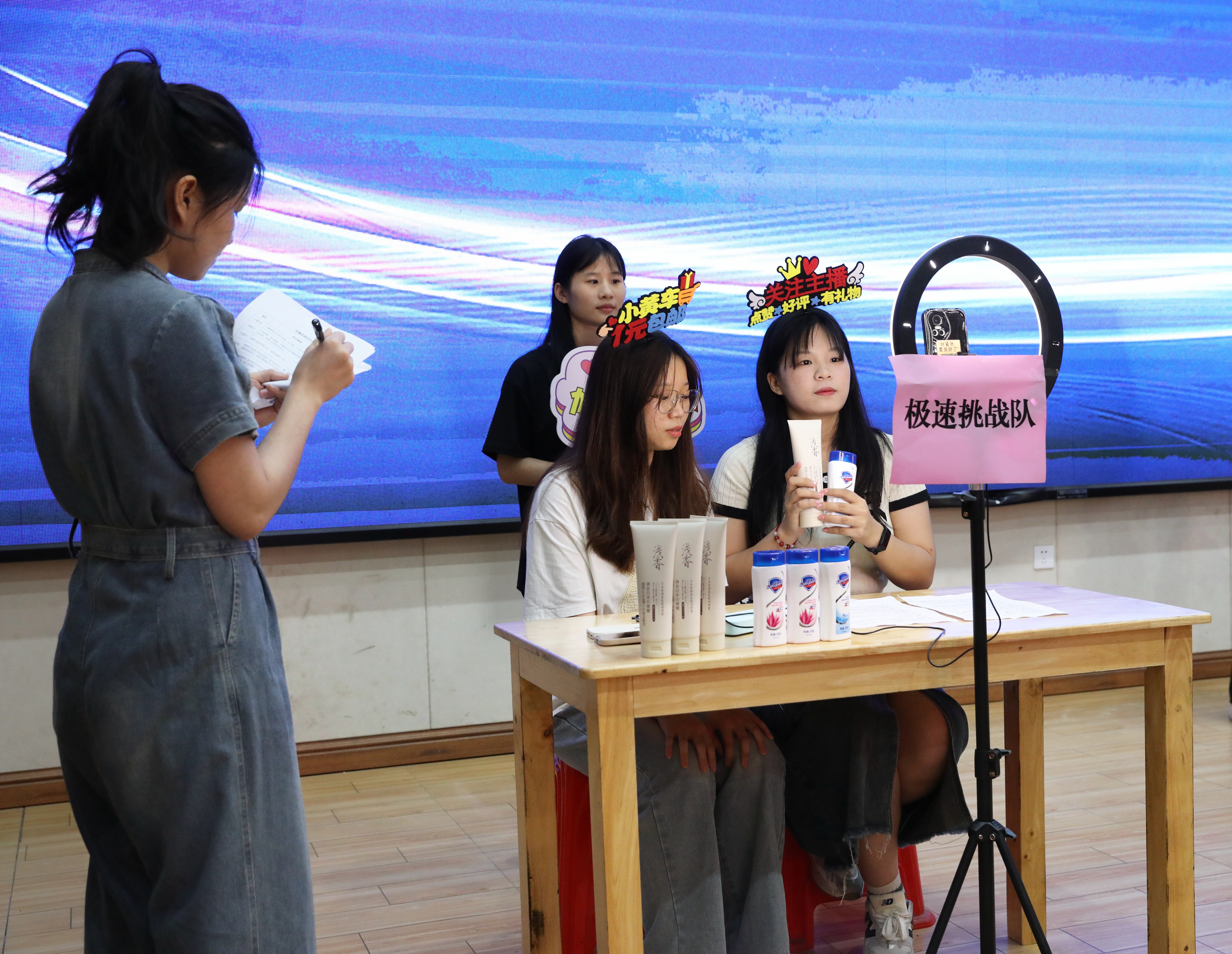 賽項總分為100分,共兩場比賽,分別是視覺營銷和直播營銷,視覺營銷賽項已于4月16日下午16時30分至18時30分完成比賽。直播營銷的比拼分為三個場次,每個場次比賽由5組同時進行。賽項的內(nèi)容是:請你以麗麗的身份,根據(jù)現(xiàn)場準備的商品,在15分鐘內(nèi)策劃一場10分鐘的現(xiàn)場模擬直播。參賽選手需緊密圍繞主題,結合商品信息進行直播,六位評委秉承“公平、公正、公開”的原則,根據(jù)選手的直播開場、商品介紹、直播互動、直播結尾、時間控制、語言表達六個方面進行評分。比賽取六位評委的平均分為選手的最終直播賽項成績。