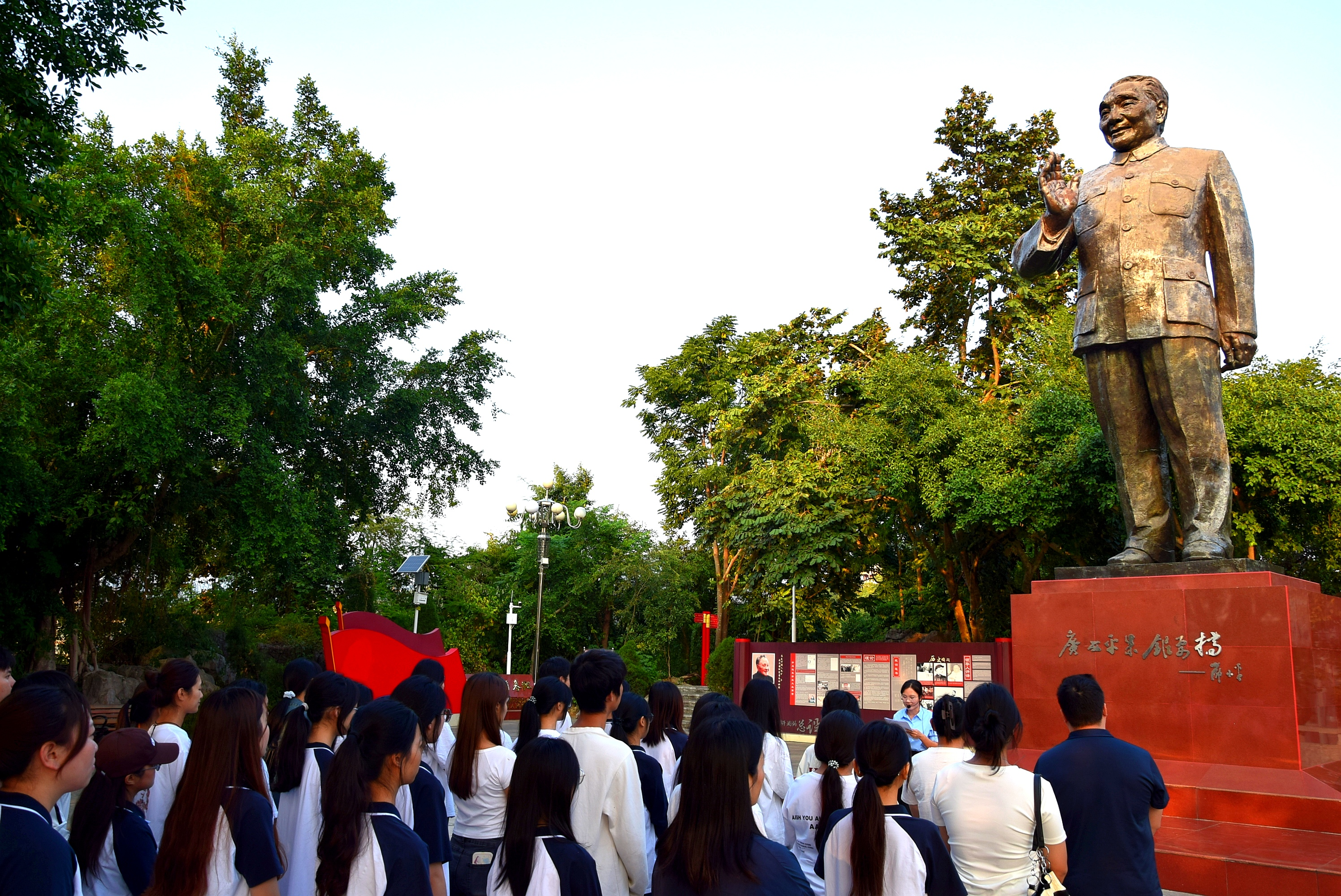 在鄧小平銅像前,馬克思主義學(xué)院思想政治課教師梁翠霞做專題授課,她主要介紹鄧小平同志簡(jiǎn)介、成長(zhǎng)經(jīng)歷、參加革命的歷程,并重點(diǎn)講述鄧小平等同志在領(lǐng)導(dǎo)發(fā)動(dòng)百色起義和創(chuàng)建右江革命根據(jù)地的事跡,以及他在右江地區(qū)、平果縣的生活經(jīng)歷。新中國(guó)成立后,在黨的十一屆三中全會(huì)召開以后,做出了一系列改變中國(guó)命運(yùn)的關(guān)鍵抉擇。特別是在1986年鄧小平說:“廣西平果鋁要搞”,這句話推動(dòng)了廣西百色“鋁工業(yè)革命”的蓬勃發(fā)展,才有了我們平果市今天的天翻地覆的滄桑巨變,由過去的“國(guó)定貧困縣”發(fā)展為“全國(guó)百?gòu)?qiáng)縣”,到現(xiàn)在成為縣級(jí)市。現(xiàn)在我們看到的鄧小平同志銅像,是為了紀(jì)念他,緬懷他對(duì)平果市的發(fā)展作出的卓越貢獻(xiàn)。在這里,我們可以感受到他的崇高理想以及精神品質(zhì)。